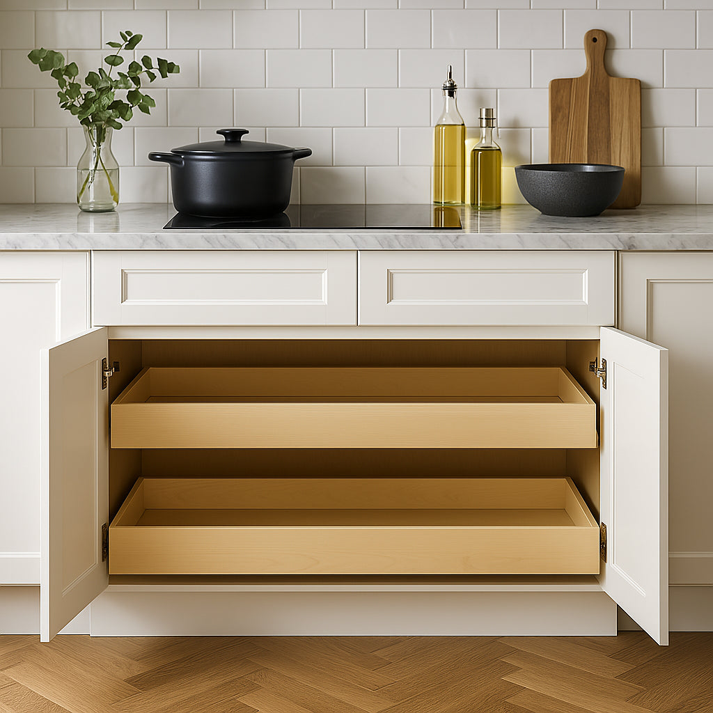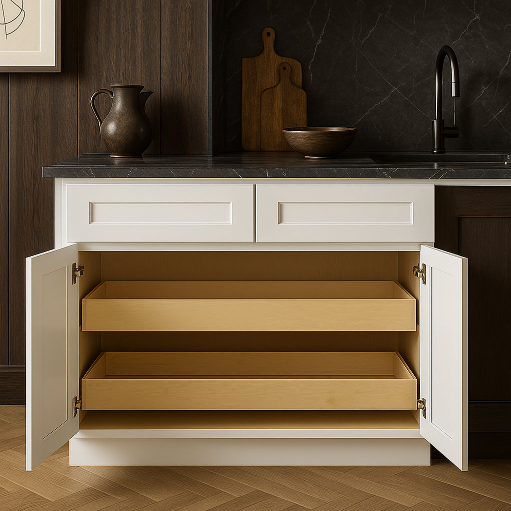 - Functional Storage: Equipped with two hardwood dovetail rollout trays for easy access to stored items.