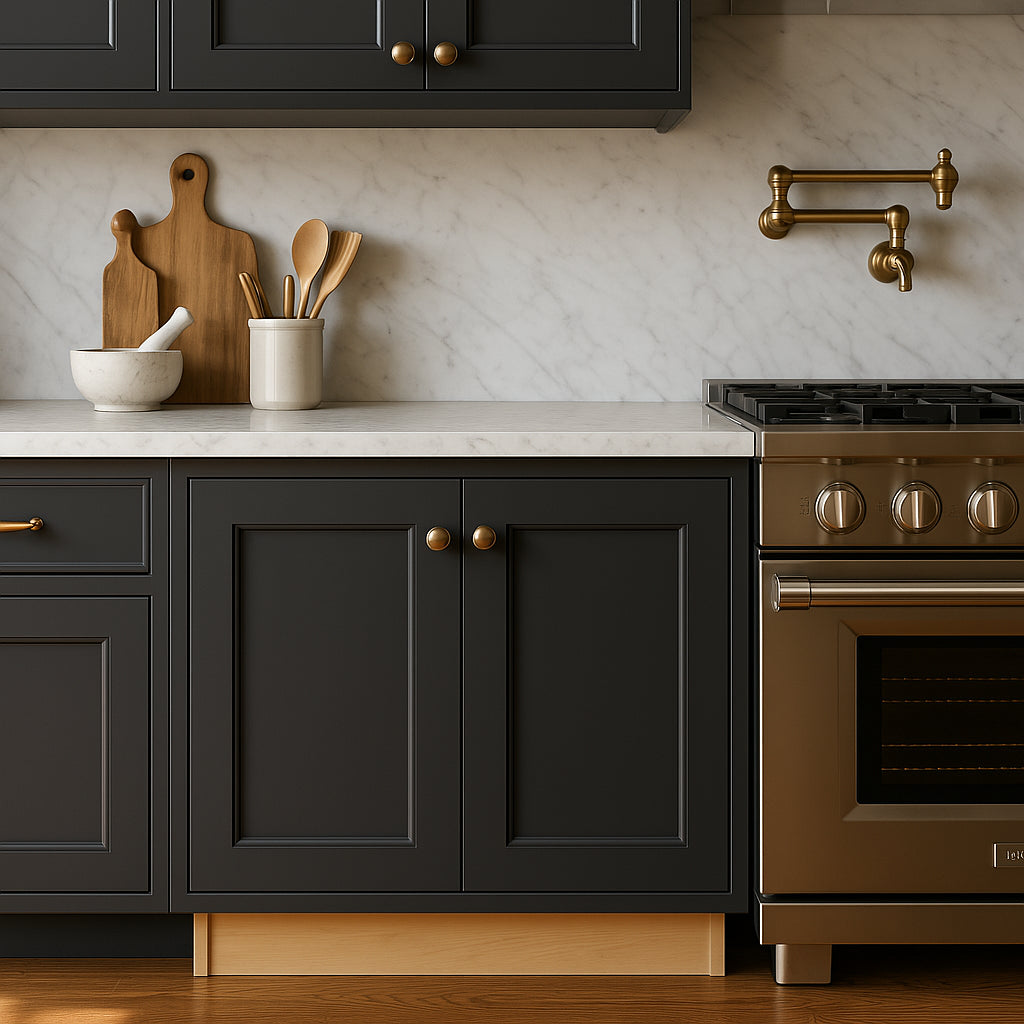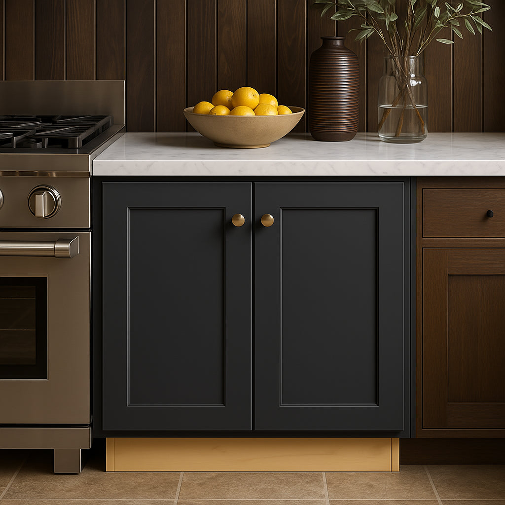 Transform your culinary space with the Newport Onyx Kitchen Cabinet, an epitome of chic sophistication. The bold onyx hue and Shaker-style design seamlessly integrate both modern and traditional aesthetics, offering versatility in style. Consider pairing it with brushed brass hardware to draw out the rich, deep tones, creating a luxurious yet timeless kitchen. This cabinet is not merely storage; it's a testament to refined taste and elegant living.