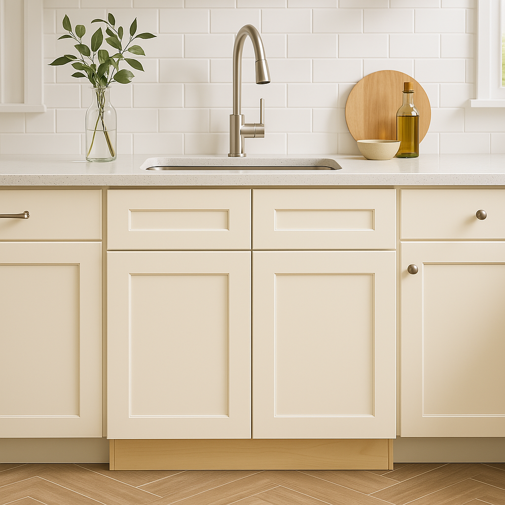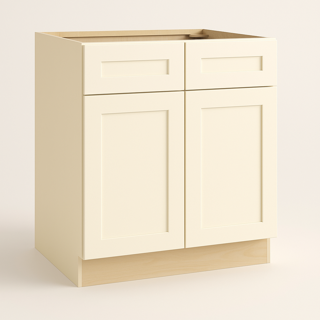 The Newport Blended Cream Base Cabinet combines durable plywood construction with a soft-close mechanism for quiet efficiency. Its shaker-style design and creamy finish bring timeless elegance to any kitchen.