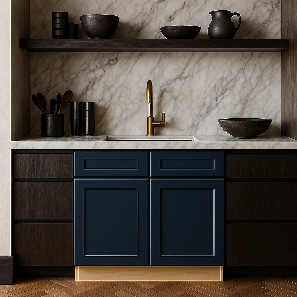 • Elegant Design: Shaker-style doors with a bold Mythic Blue finish create a standout look.