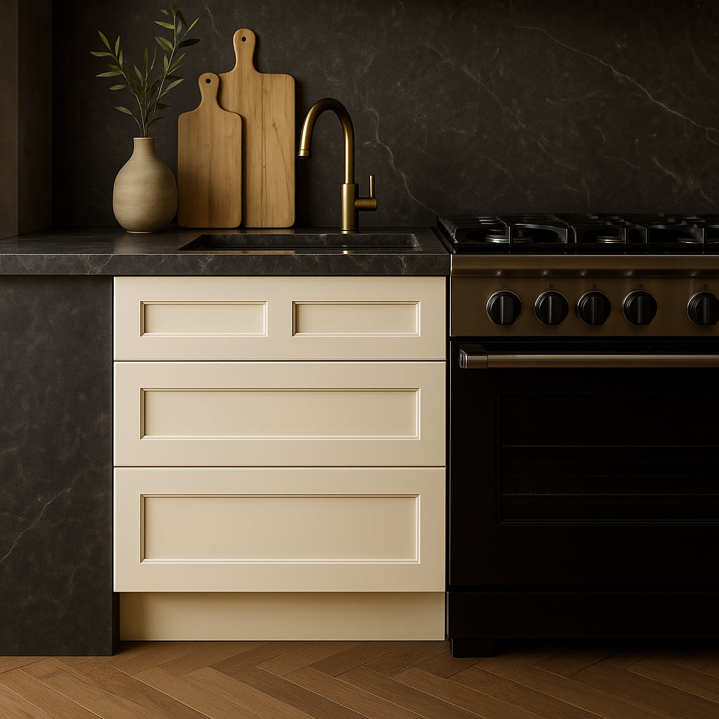 The Newport Cooktop Base Cabinet combines durable plywood construction with a sophisticated Shaker-style design in a Blended Cream finish. Featuring soft-close drawers and customizable options, it is perfect for enhancing any kitchen space.