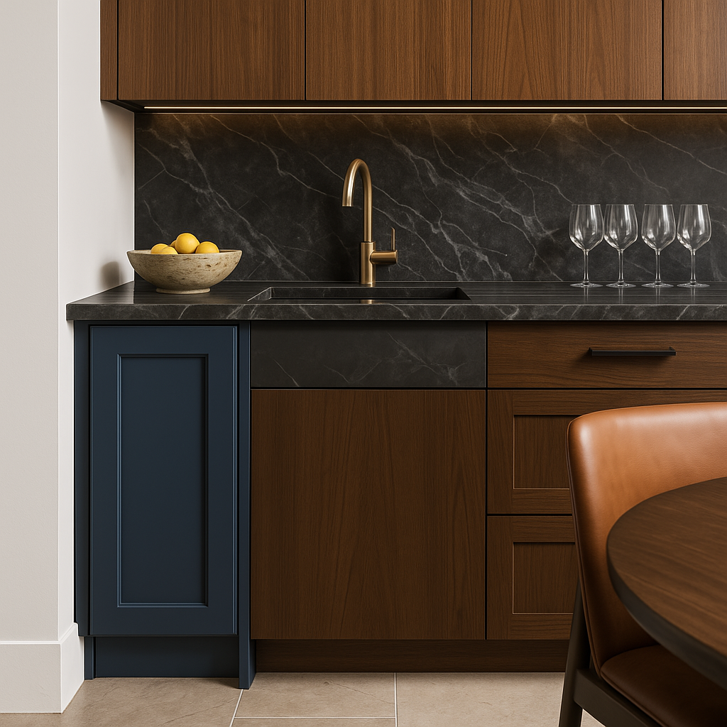- Shaker Design: Bold geometric shaker-style doors with recessed panels.