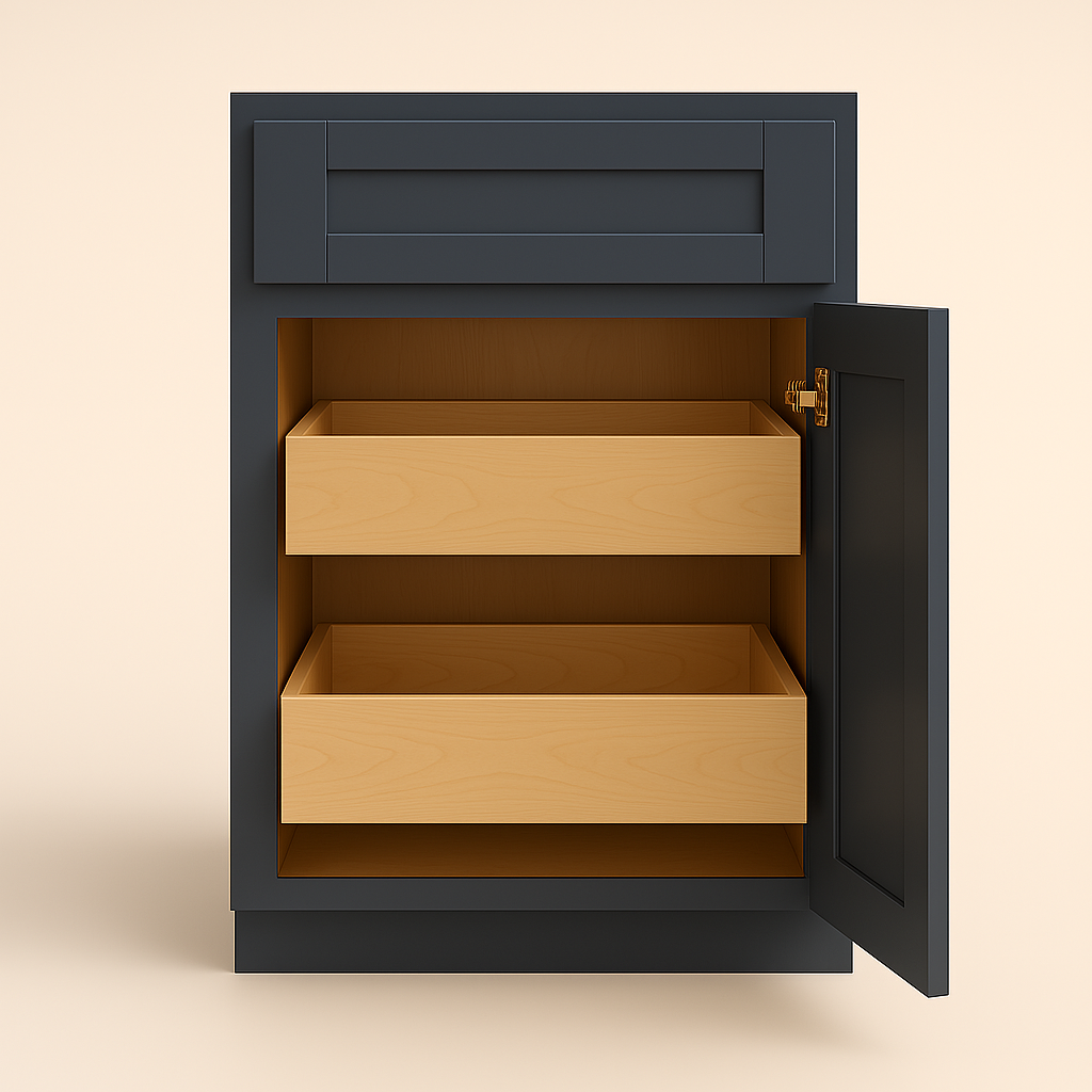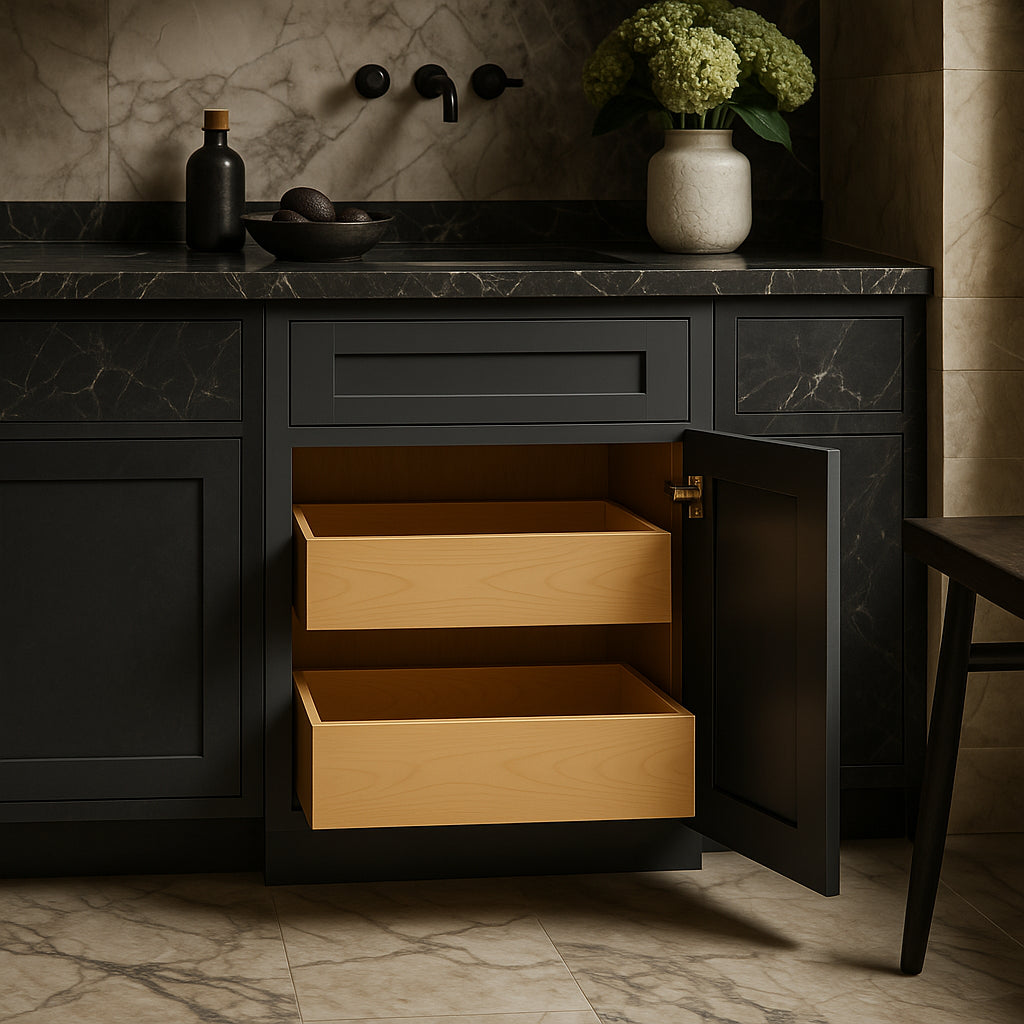 The Washington Base Cabinet in Valiant Onyx is a statement piece that transforms any kitchen into a modern haven. Its bold, dark finish pairs beautifully with contrasting countertops and metallic accents, creating a sophisticated and dramatic aesthetic. Style it with gold hardware and a marble countertop for a luxurious touch that enhances its sleek design. This cabinet is not just functional but a centerpiece that elevates the entire space.