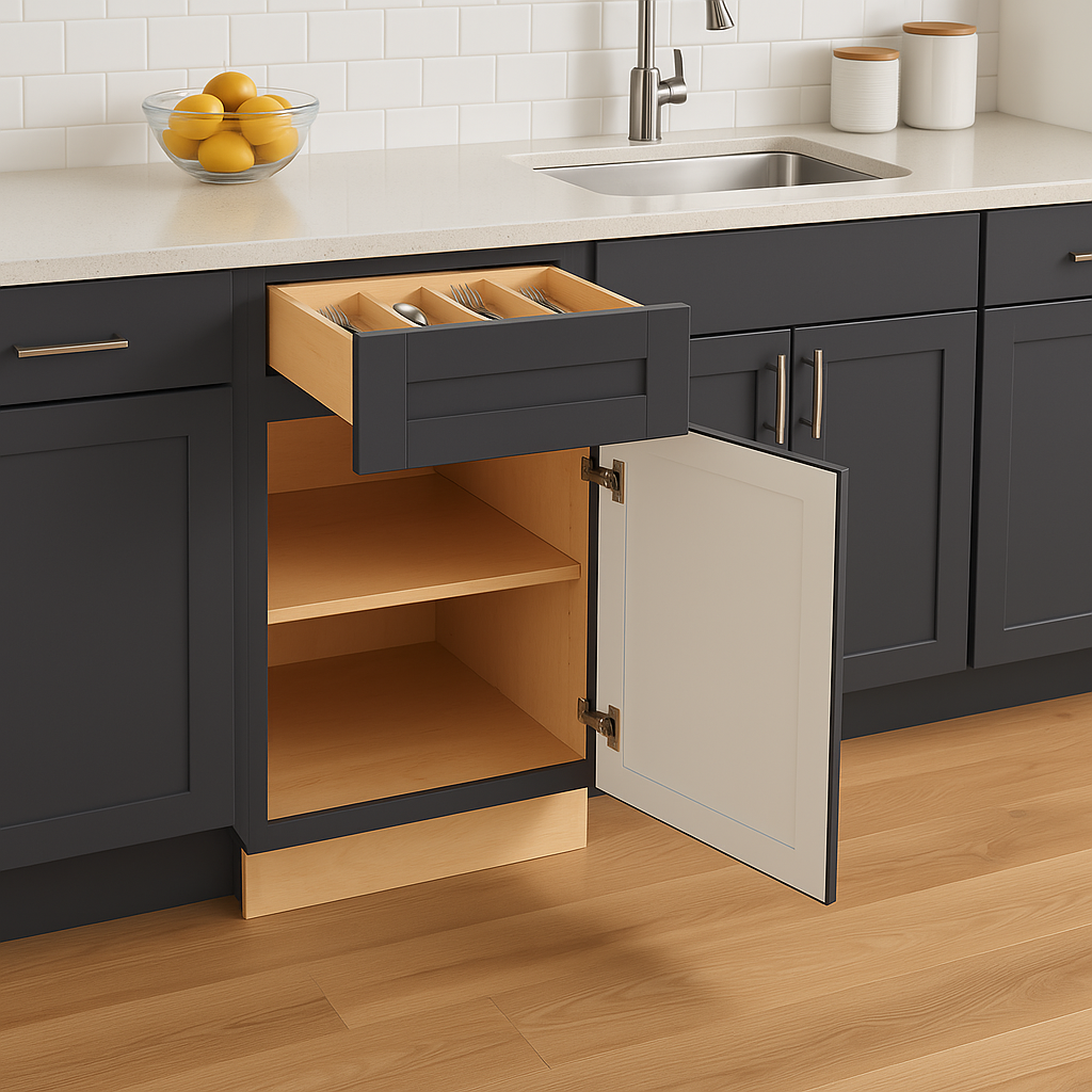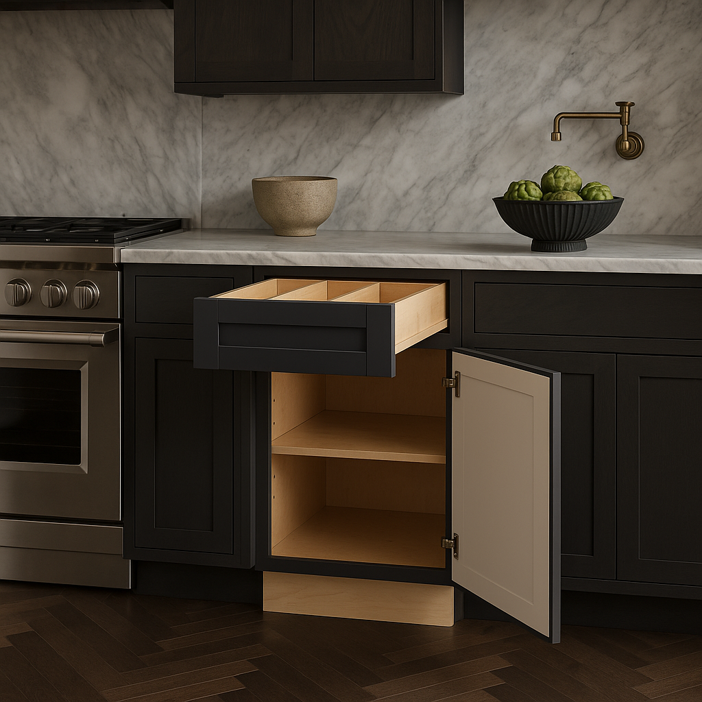 The Washington Onyx Shaker Kitchen Cabinet combines modern elegance with practical functionality. Featuring durable all-plywood construction, a scuff-resistant onyx finish, and soft-close doors and drawers, this cabinet is perfect for enhancing any kitchen space.