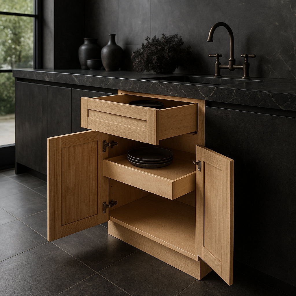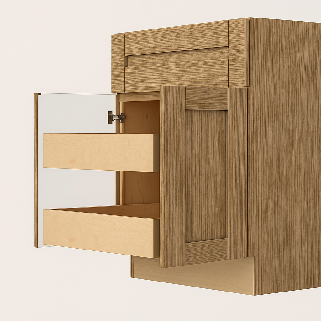 - Elegant Design: Shaker-style doors with a Vanguard Oak finish for a timeless aesthetic.