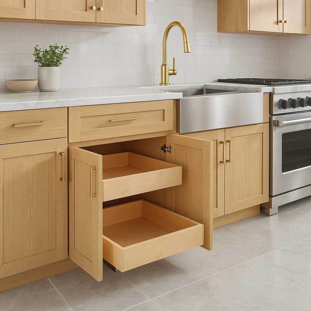 The Washington Oak Kitchen Cabinet combines classic shaker-style design with modern features like soft-close doors and adjustable shelves. Crafted from durable plywood and finished in Vanguard Oak, it offers both elegance and practicality for any kitchen.