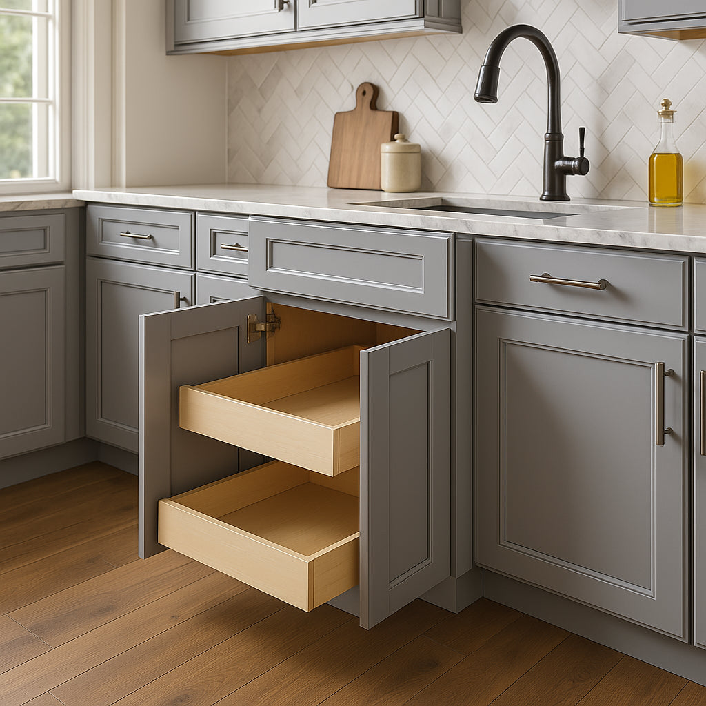 The Washington Veiled Gray Plywood Shaker Cabinet combines modern sophistication with practical design. Featuring soft-close doors, durable plywood construction, and adjustable shelves, it offers both style and functionality for your kitchen.