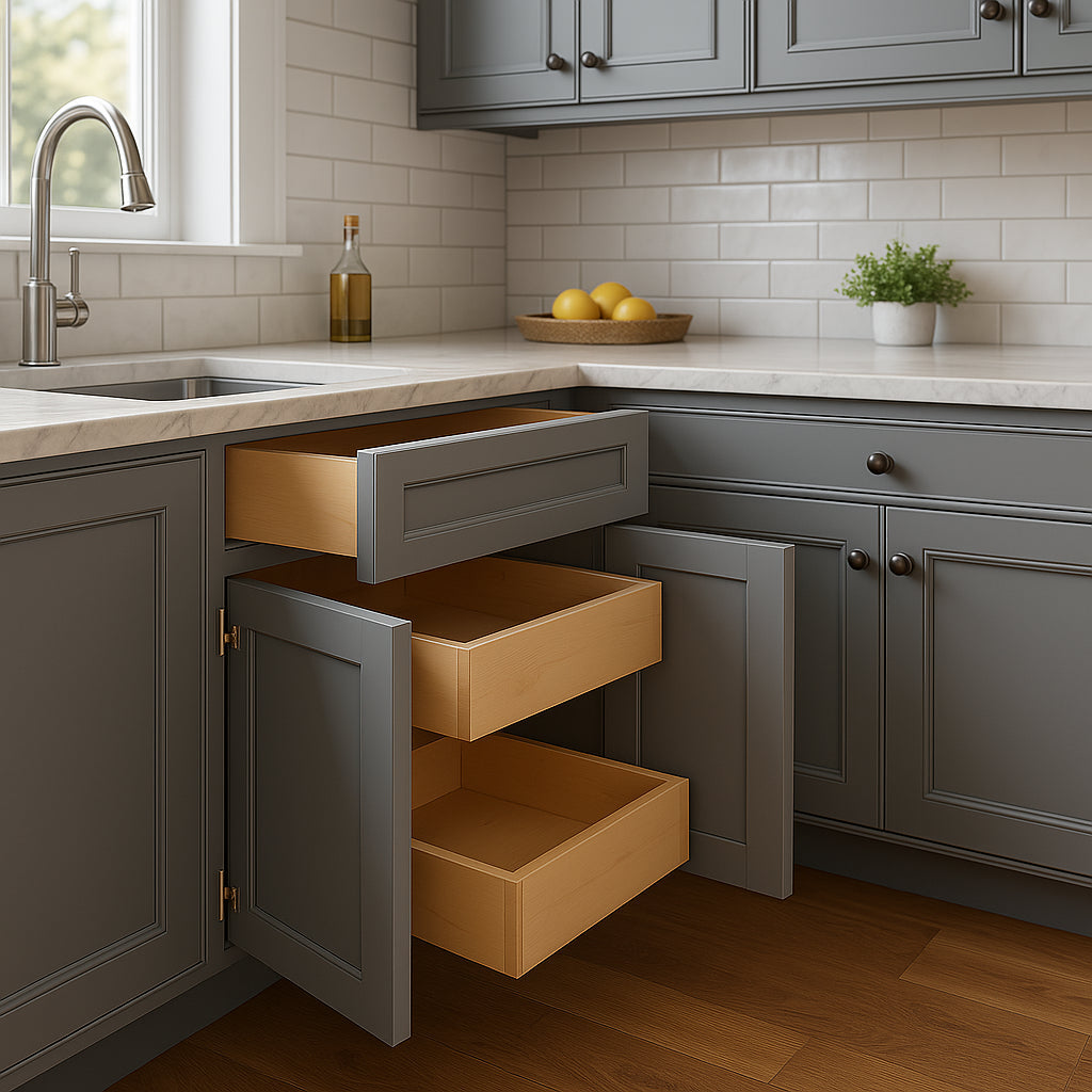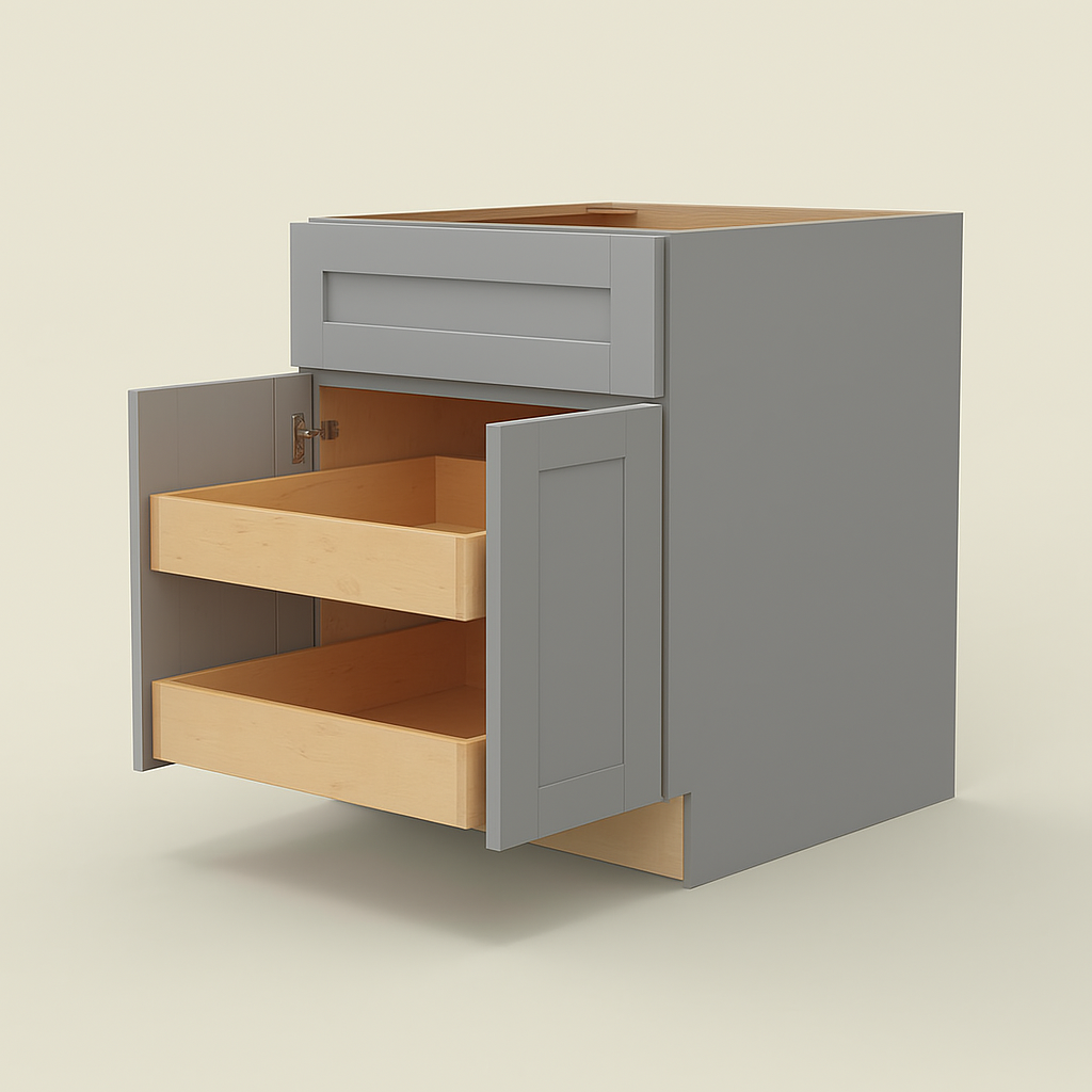 The Washington Veiled Gray Shaker Base Cabinet combines elegant design with robust construction. Featuring soft-close doors, adjustable shelves, and a durable plywood build, it offers both style and functionality for modern kitchens.