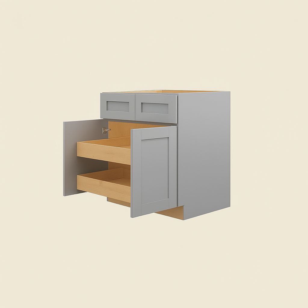 The Washington Veiled Gray Shaker Base Cabinet combines timeless shaker design with modern features like soft-close doors and durable plywood construction. Its veiled gray thermofoil finish is easy to clean and adds a sophisticated touch to any kitchen.