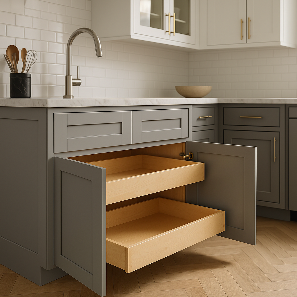 - Shaker Design: Timeless shaker-style doors with wide frames and recessed center panels.