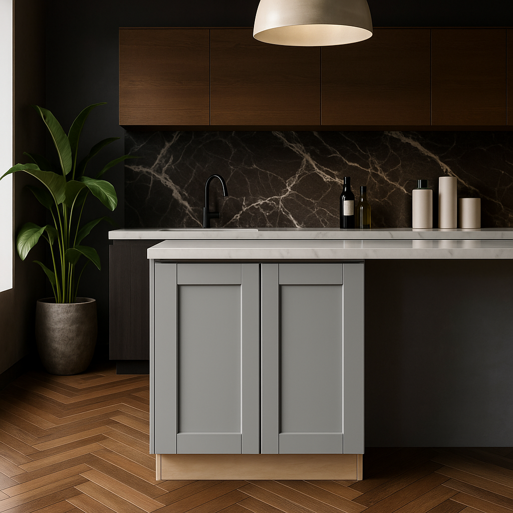 Imagine a kitchen that exudes sophistication and practicality with the Veiled Gray Shaker Base Cabinet. Its wide-framed shaker doors, finished in a serene gray, bring a touch of modern elegance to any space. Pair it with marble countertops and brushed nickel hardware for a harmonious blend of style and functionality. This cabinet is not just a storage solution but a statement piece that elevates your kitchen to a realm of refined luxury.