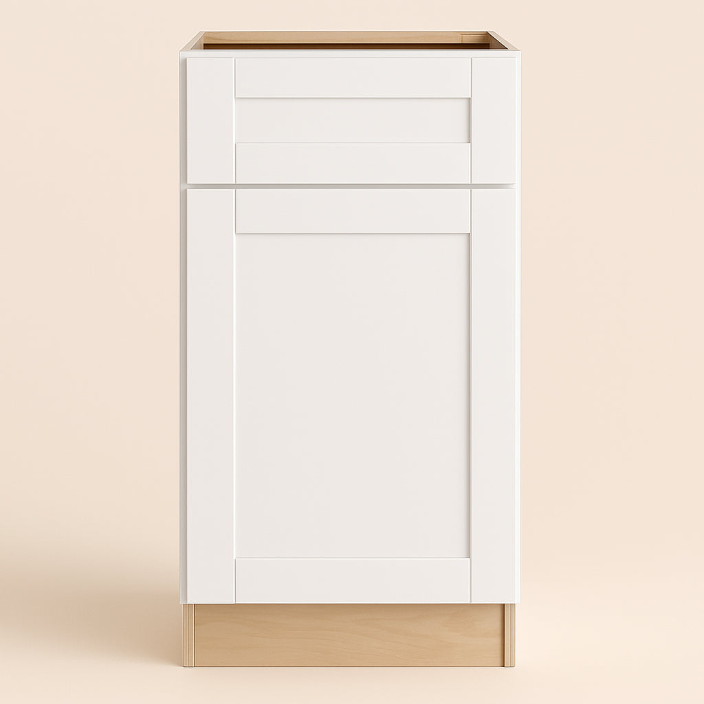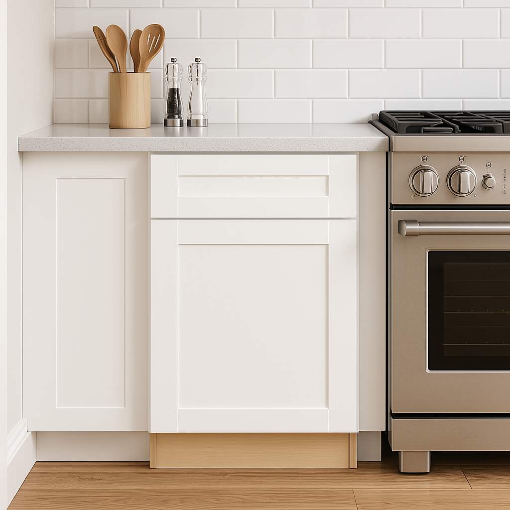 The Washington Vesper White Shaker Kitchen Cabinet combines durable plywood construction with a stylish design, featuring soft-close technology and adjustable shelves for customizable storage. Its white vinyl clad surface ensures easy maintenance and a pristine look.