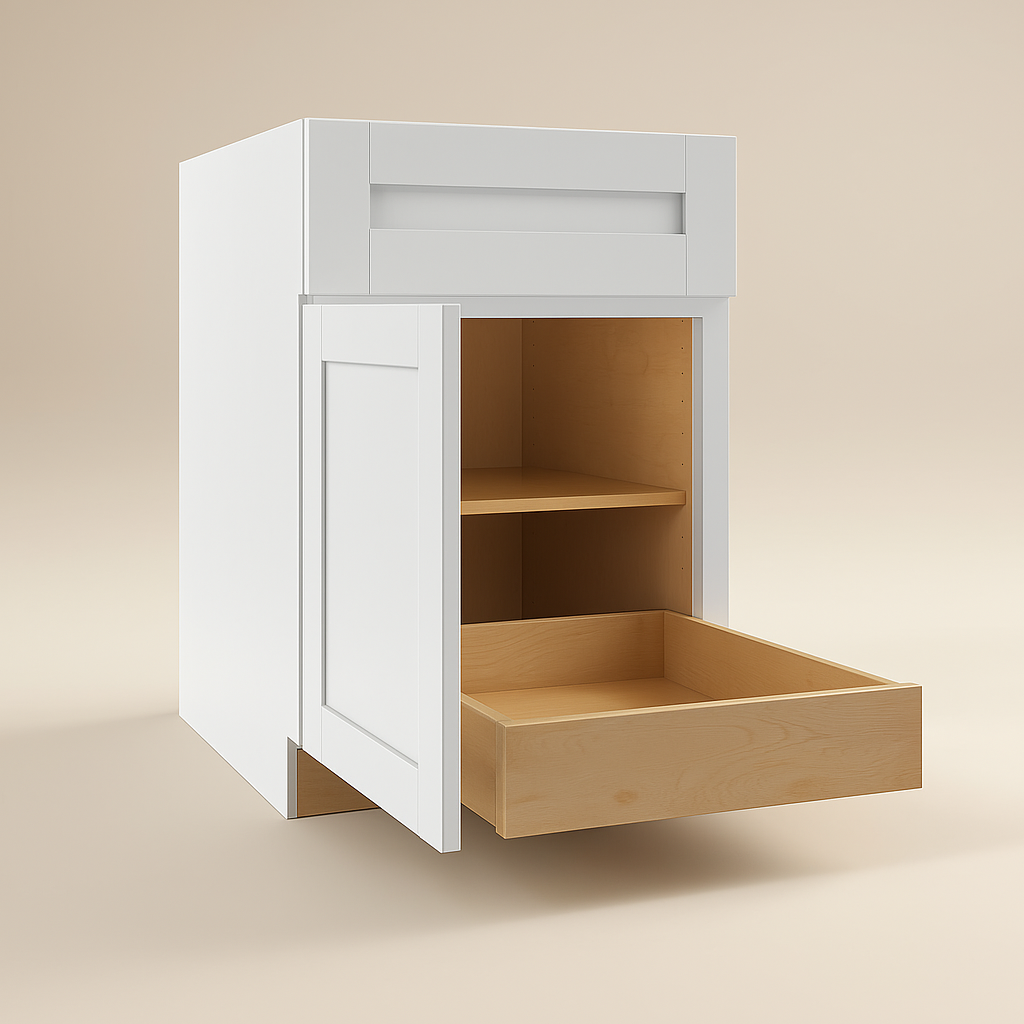 The Washington Vesper White Shaker Base Kitchen Cabinet combines modern elegance with practical functionality. Crafted from durable CARB II compliant plywood, it features a soft-close mechanism, adjustable shelves, and a sleek Vesper White finish, making it a perfect addition to any kitchen.