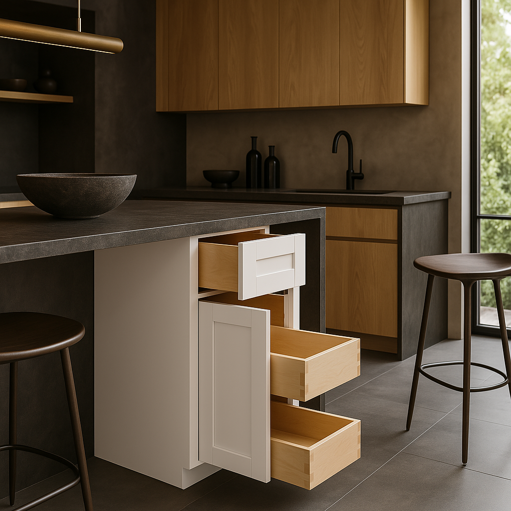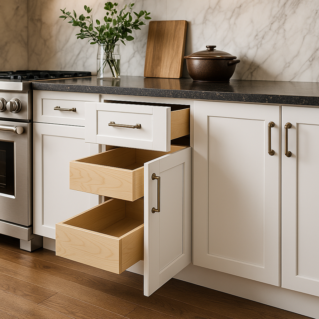 Kitchen Cabinet Features Finished Interior, Full Extension Drawers, Modular, Moisture Resistant, Soft Close Doors, Soft Close Drawers, Solid Wood, Structural Toe Kicks Included