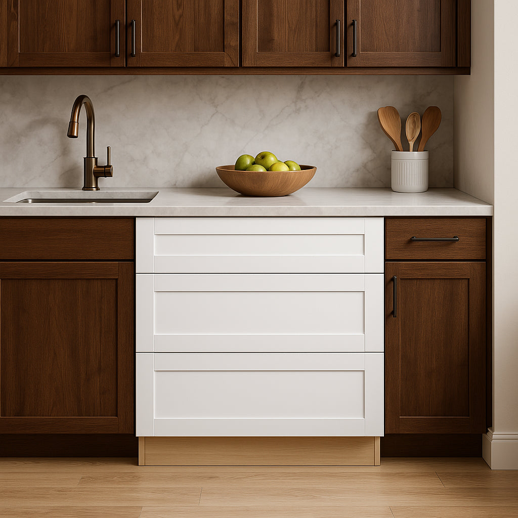 The Washington Vesper White Shaker Cooktop Base Cabinet combines modern elegance with practical functionality. Crafted from durable CARB II compliant plywood, it features soft-close drawers and a false top drawer for cooktop integration, making it a stylish and efficient addition to any kitchen.