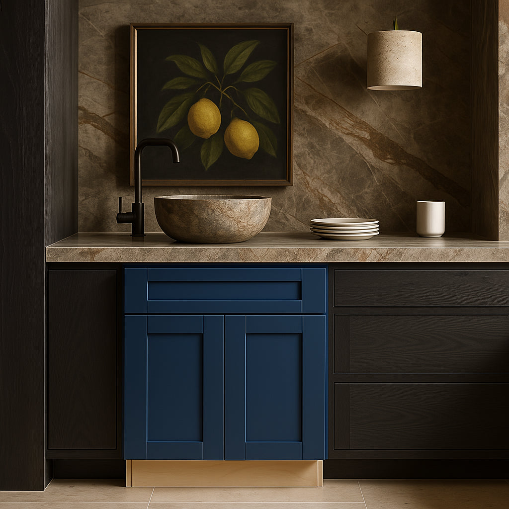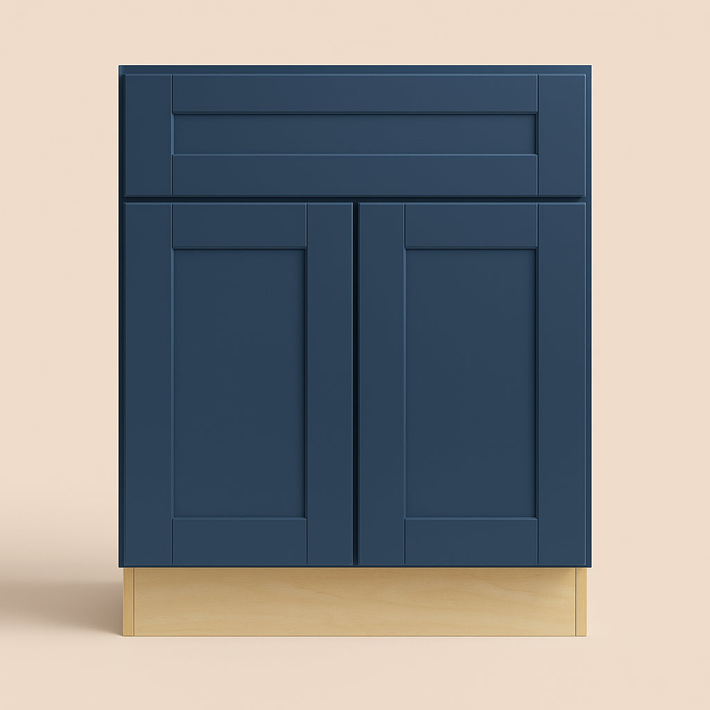 The Washington Vessel Blue Shaker Base Cabinet combines modern design with practical functionality. Featuring a deep blue finish and CARB II compliant plywood construction, it offers durability and style. Equipped with soft-close technology and adjustable storage, this cabinet is perfect for enhancing any kitchen.