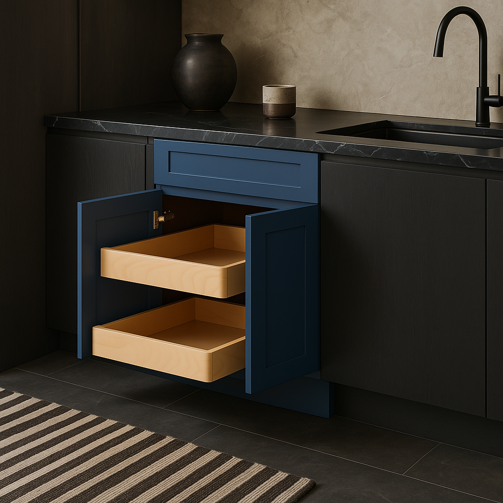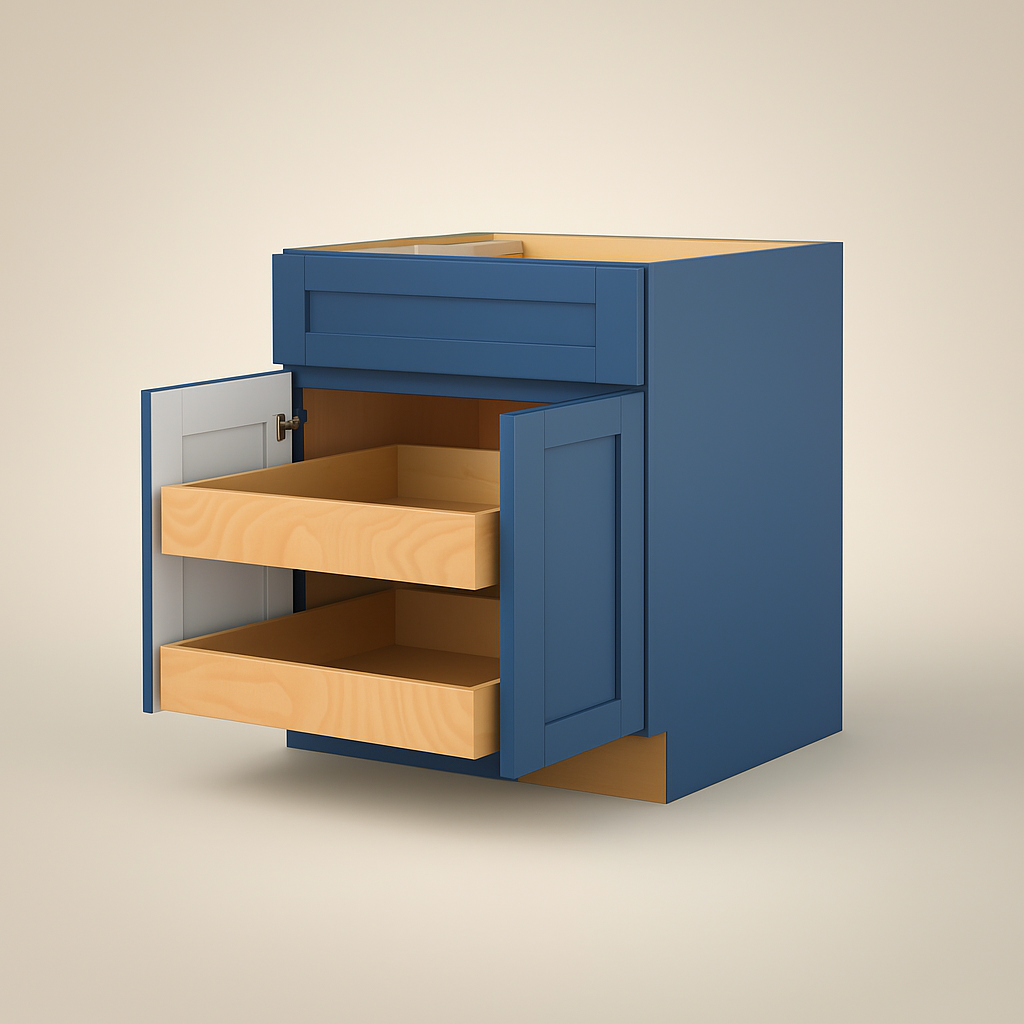 The Vessel Blue Shaker Base Cabinet is a statement piece that elevates any kitchen with its rich, dramatic blue finish and modern shaker design. Its soft-close features and roll-out trays ensure both functionality and luxury, while the contrasting white interior panel adds a touch of architectural intrigue. Pair it with light countertops and metallic accents for a sophisticated, contemporary look that blends style and practicality seamlessly.