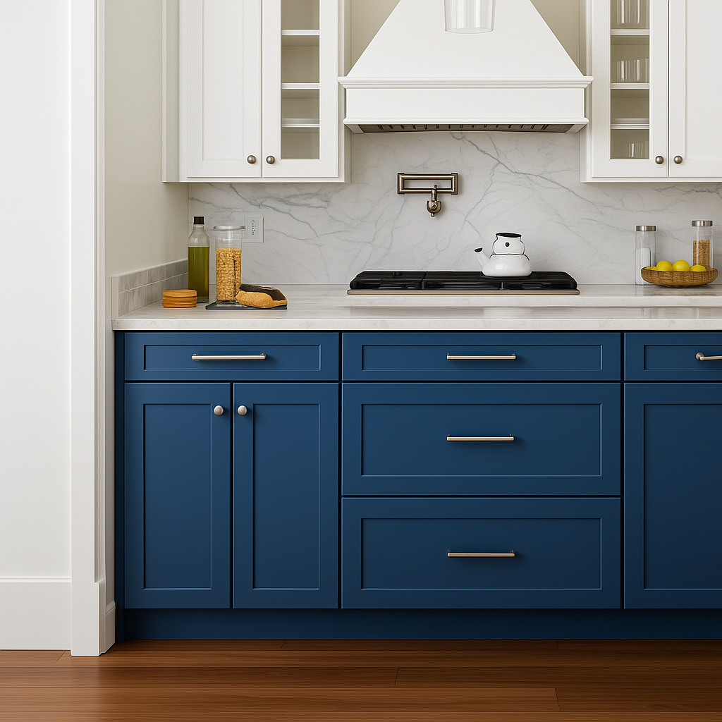 - Elegant Design: Contemporary shaker style with a rich blue vinyl finish.