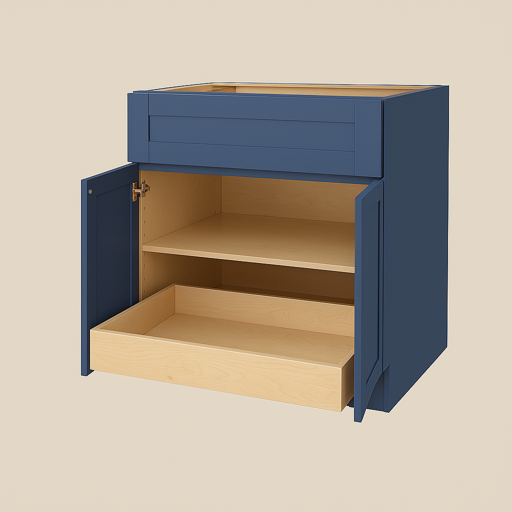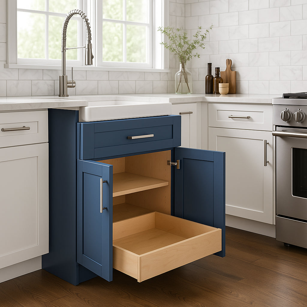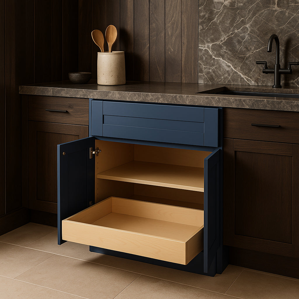 Envision your kitchen cloaked in the deep, inviting hue of Vessel Blue, instantly becoming the heart of your home. The crisp lines of the shaker-style doors create a harmonious blend of modern sophistication and timeless charm. Pair this cabinet with polished brass hardware for a touch of opulence, or alongside white marble counters for a classic contrast. Such a striking piece is not just cabinetry; it’s a celebration of refined taste, bringing luxury and practicality into your culinary space.