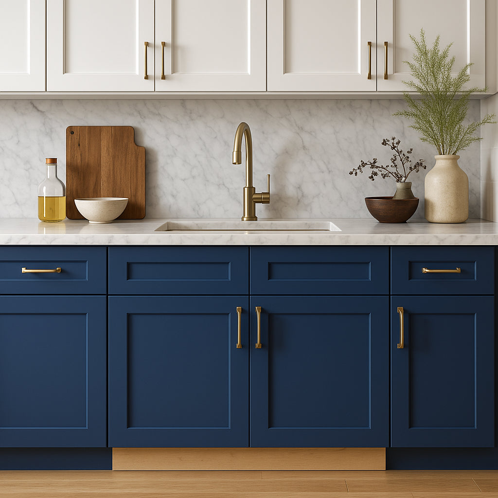 - Elegant Design: Shaker-style doors with a recessed center panel and vessel blue vinyl finish.