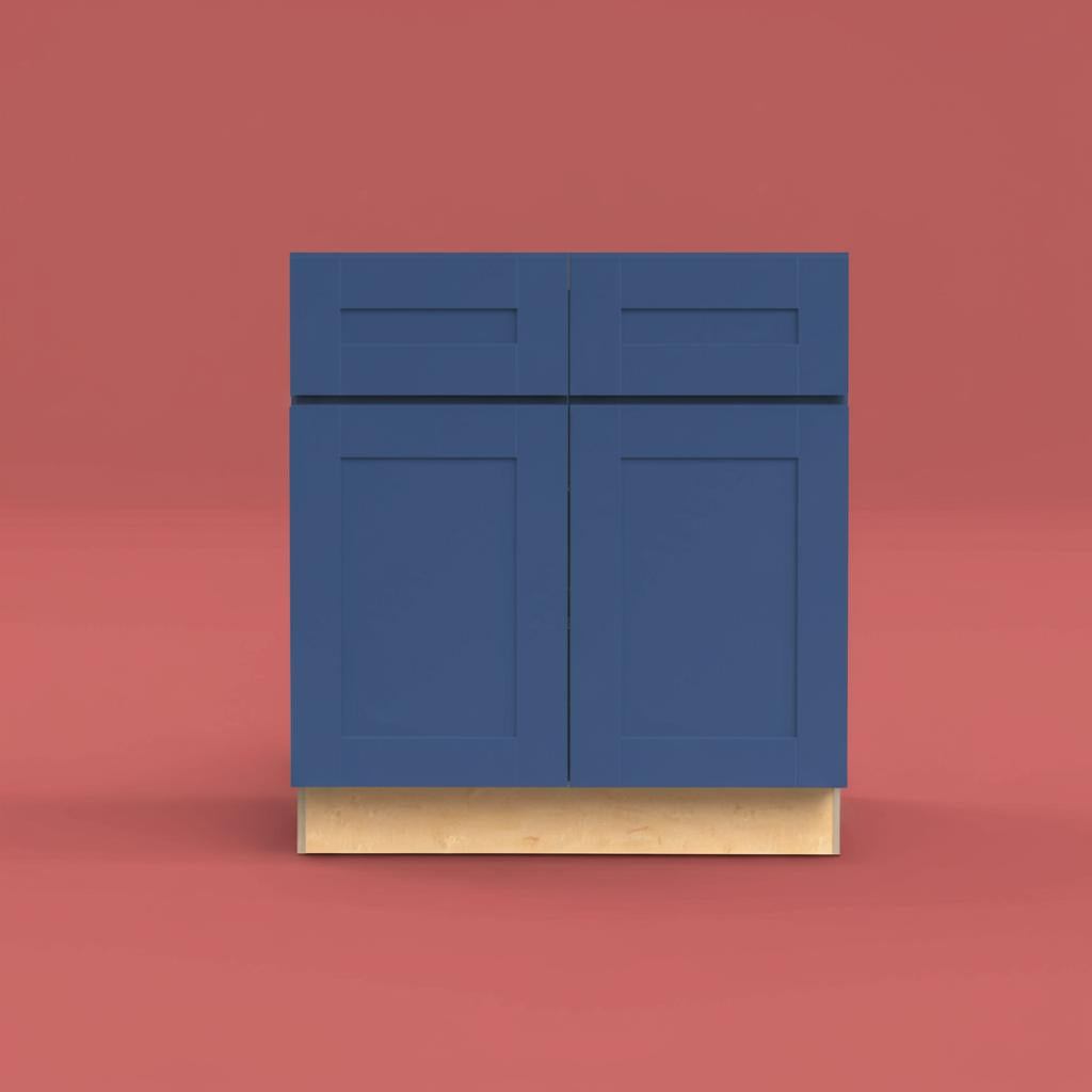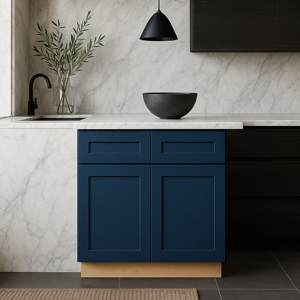 Transform your kitchen into a masterpiece of modern design with the Washington Vessel Blue Shaker Base Cabinet. Its deep blue finish exudes sophistication, while the contrasting white back panel adds a touch of contemporary flair. Pair it with light countertops and stainless steel appliances for a striking visual impact. This cabinet is not just a storage solution; it's a statement piece that redefines luxury in your culinary space.