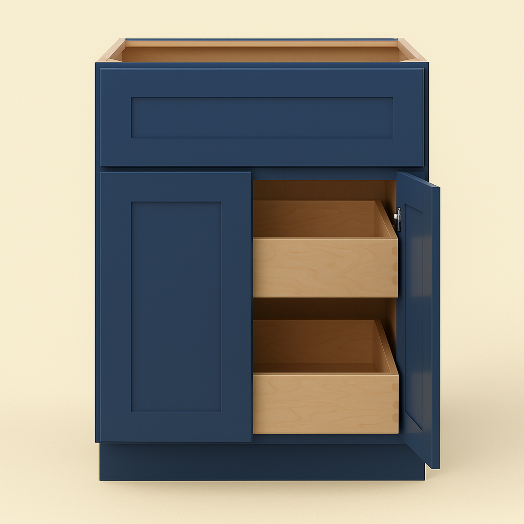 The Washington Vessel Blue Shaker Base Cabinet combines modern design with durable construction. Featuring a vibrant blue finish, soft-close technology, and adjustable hinges, it offers both style and functionality for your kitchen.