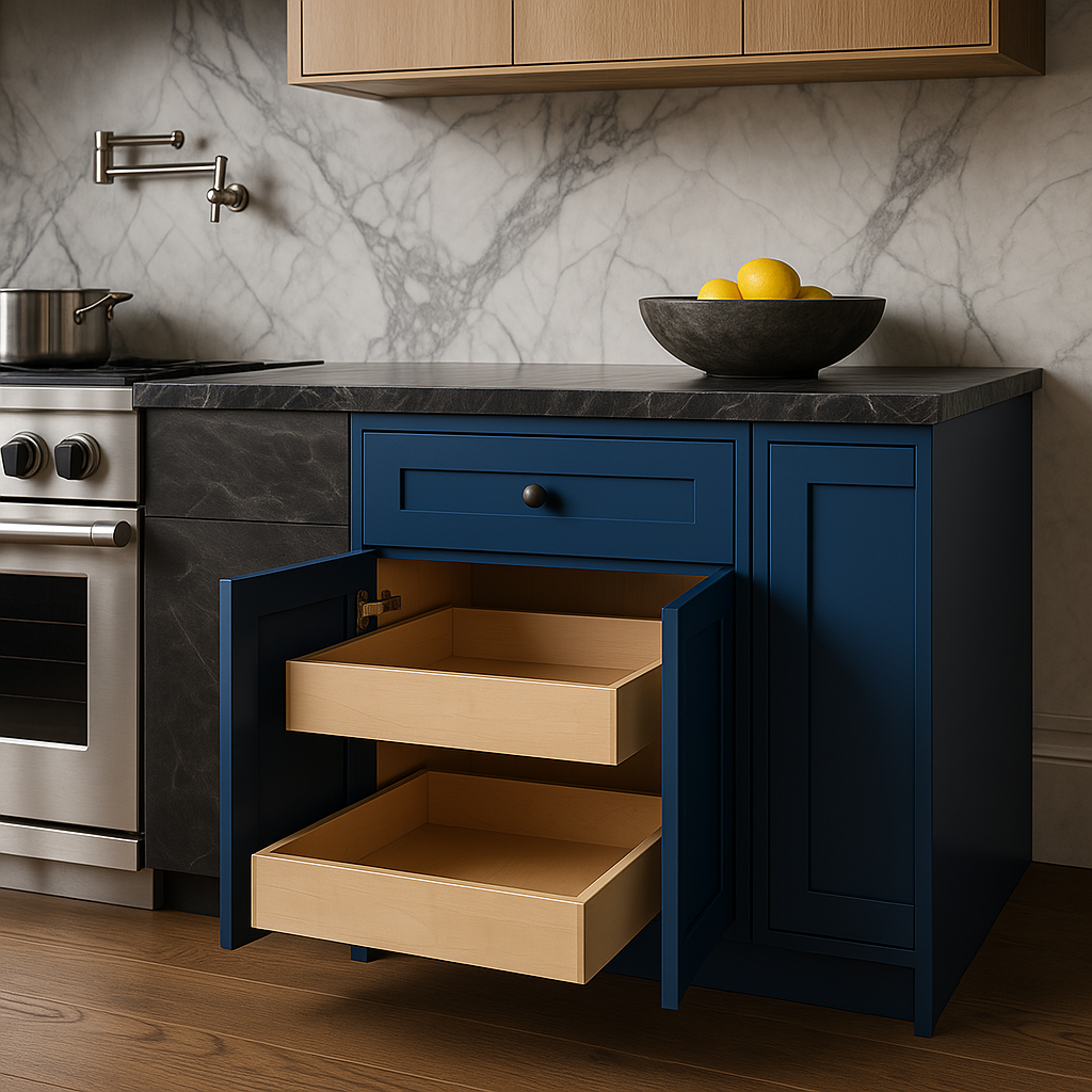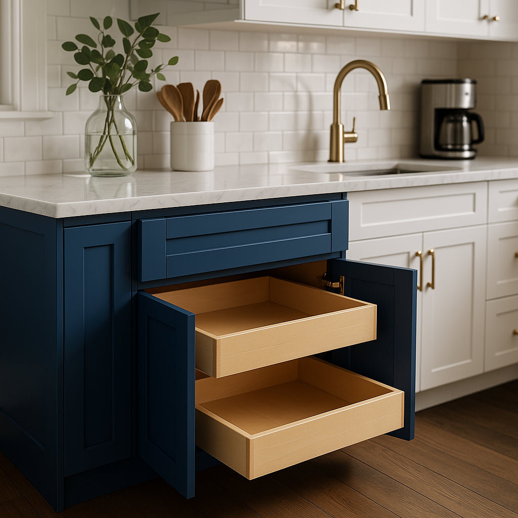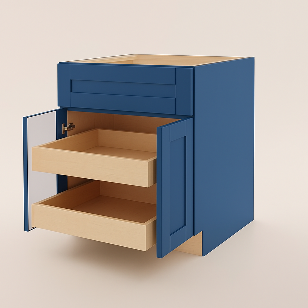 The Washington Vessel Blue Base Cabinet combines bold design with practical features, including soft-close technology and durable CARB II compliant plywood construction. Its striking vessel blue finish and shaker-style doors make it a standout addition to any modern kitchen.