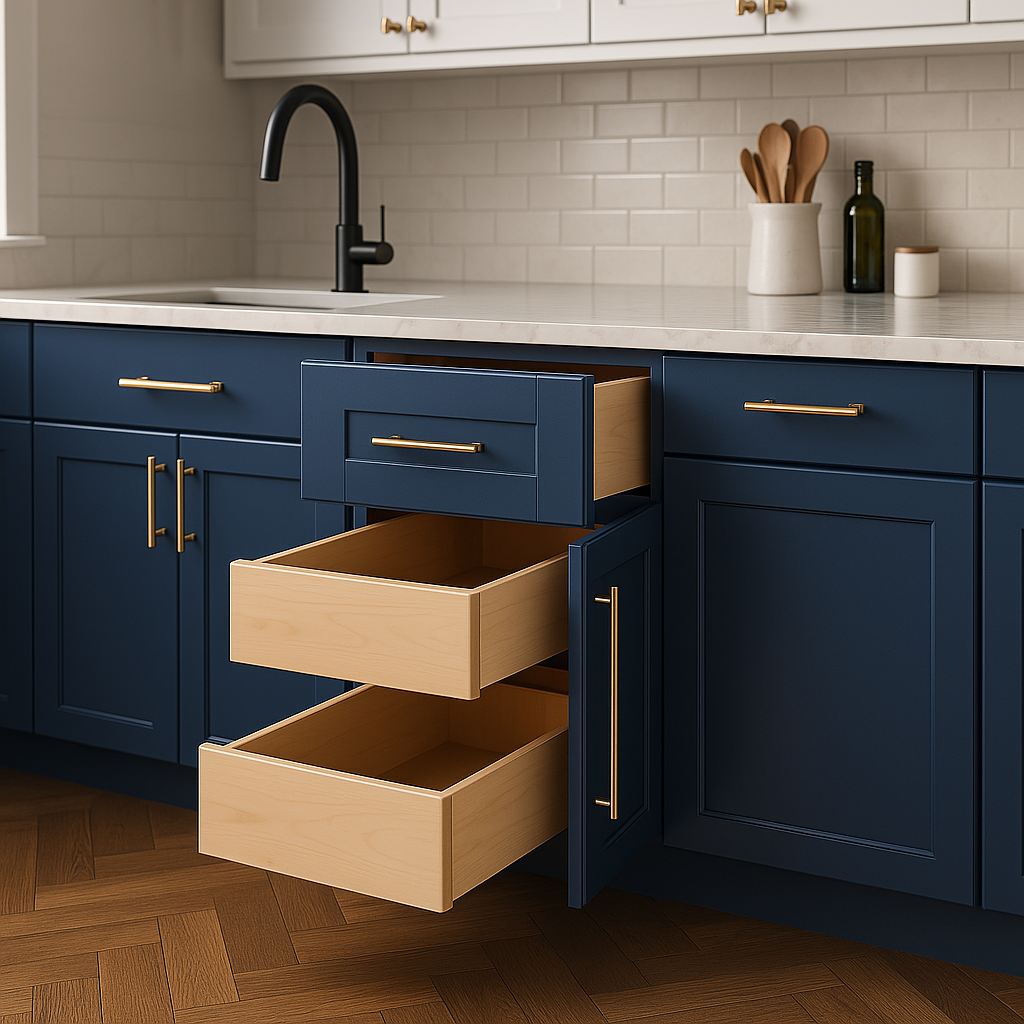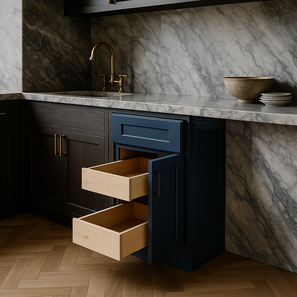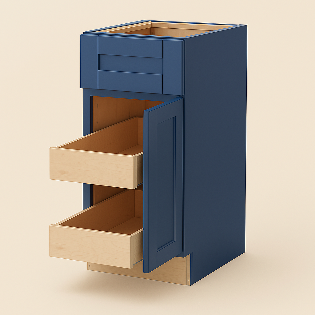 The Washington Vessel Blue Shaker Base Cabinet combines robust CARB II compliant plywood construction with a striking deep blue vinyl finish. Featuring soft-close doors and adjustable hinges, it offers both style and functionality for modern kitchens.