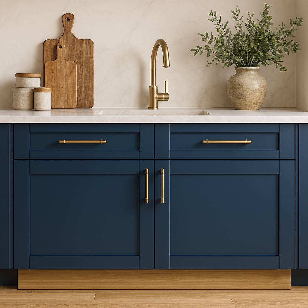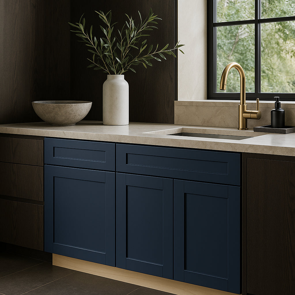 The Washington Vessel Blue Shaker Base Cabinet combines modern elegance with practical design. Featuring a deep blue vinyl finish, MDF shaker doors, and soft-close technology, this cabinet is both stylish and functional. Its CARB II compliant plywood construction ensures durability, making it a perfect addition to any kitchen.