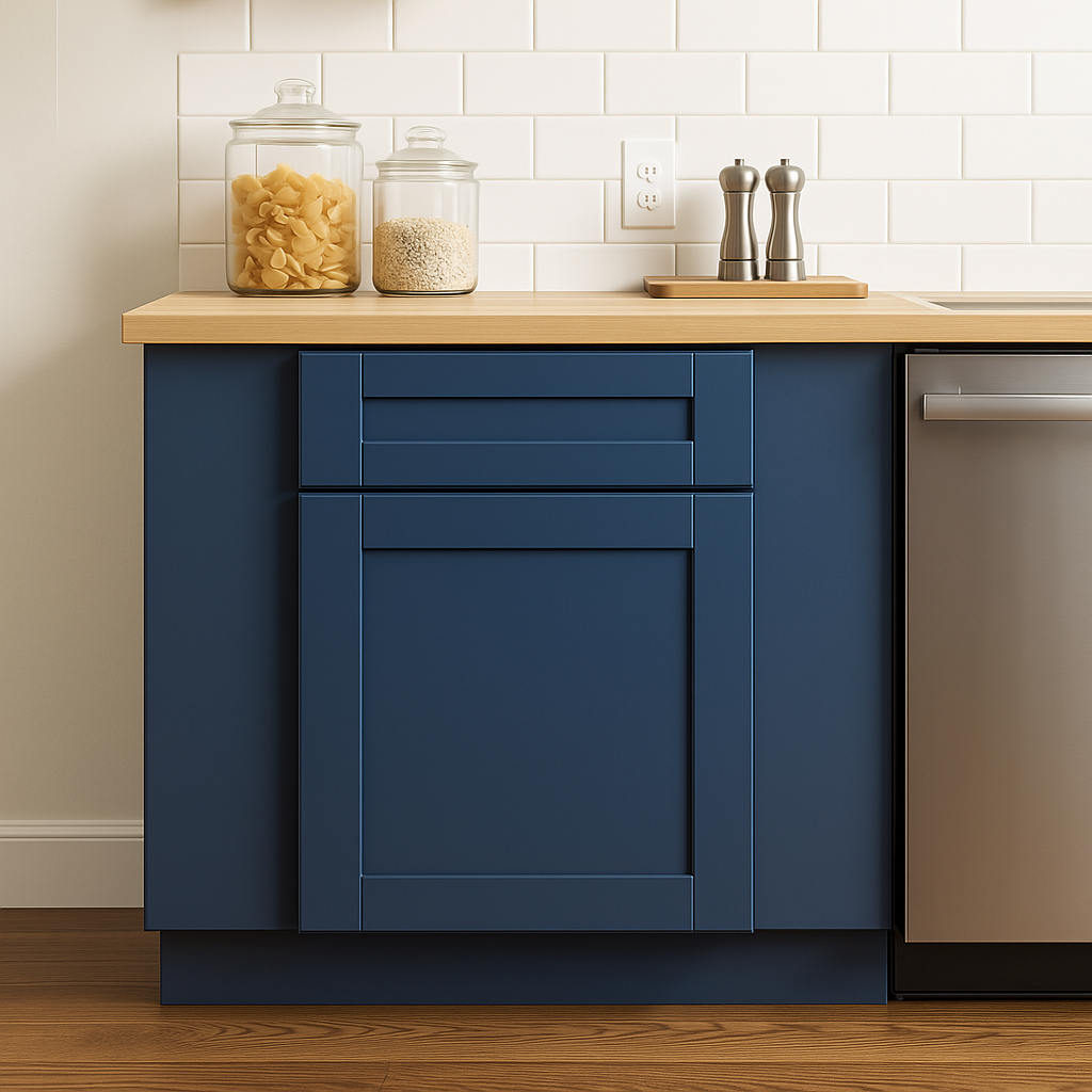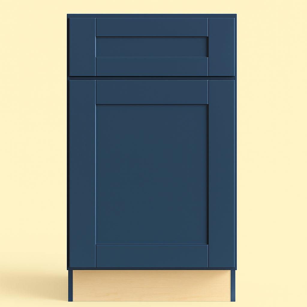 Upgrade your kitchen with the Vessel Blue Shaker Base Cabinet and redefine your space with modern elegance.