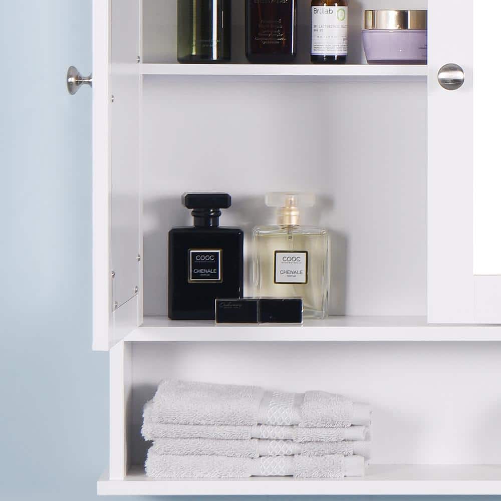 Transform your bathroom into a sanctuary of style and order with this sleek medicine cabinet. Crafted from durable MDF with a refined white finish, its minimalist design and dual-mirrored doors project a bright, expansive feel. Arrange it above your vanity to effortlessly store toiletries and open up extra counter space. An essential addition to any luxury bath setting, its versatility ensures orderly elegance in even the smallest of spaces.