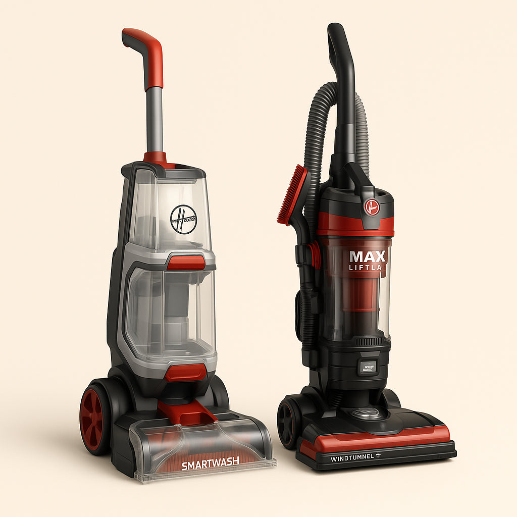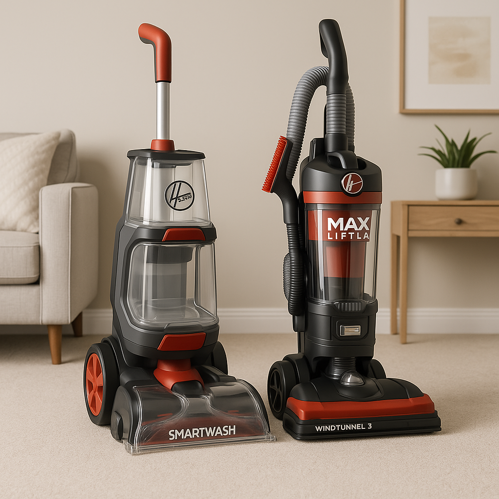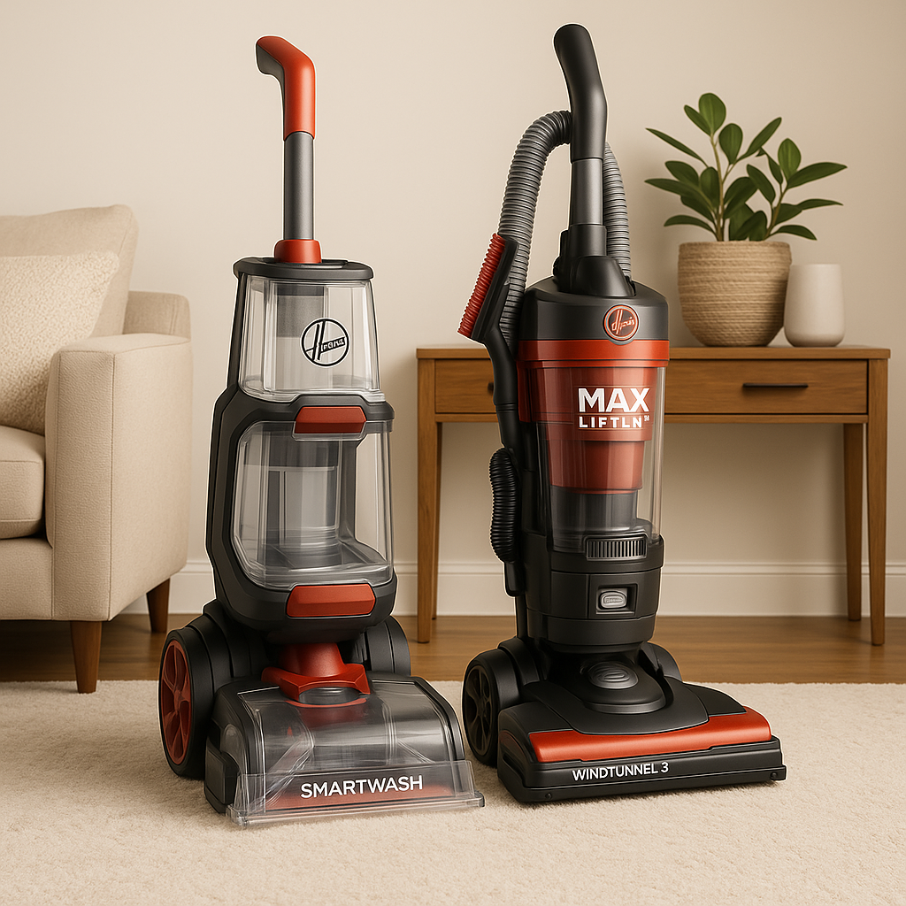 The HOOVER SmartWash and WindTunnel 3 Vacuum duo offers advanced cleaning technology for pet owners and families. With motion-sensing automatic cleaning and tri-channel suction, it ensures spotless carpets and efficient dirt removal.