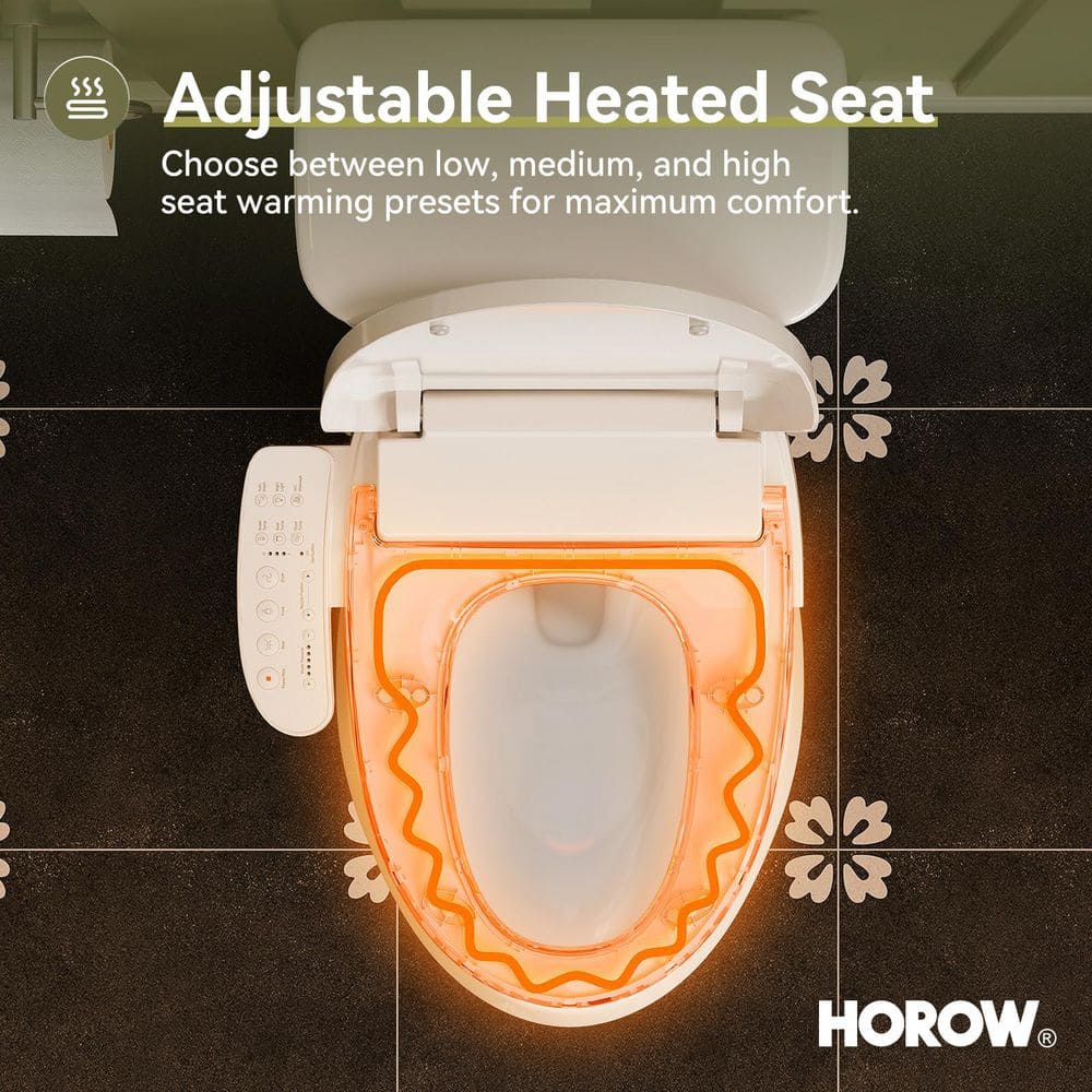 Experience unparalleled comfort with the HOROW 19 in. Tall High-Efficiency Toilet featuring a smart bidet seat. Crafted from durable vitreous china, this elongated, comfort height toilet is perfect for all ages, providing luxurious features like seat heating, warm water wash, and adjustable bidet functions, enhancing any modern bathroom setup.