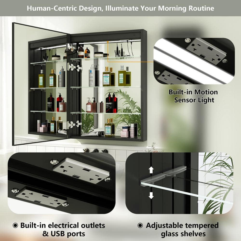 A: It comes with adjustable glass shelves, a built-in motion sensor light, electrical outlets, and a USB port, providing versatile storage and easy access to power for your bathroom devices.