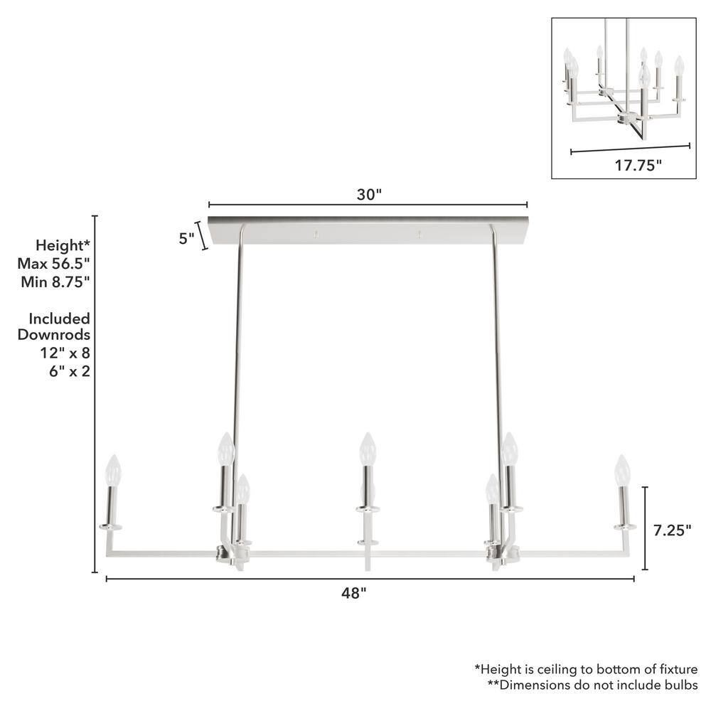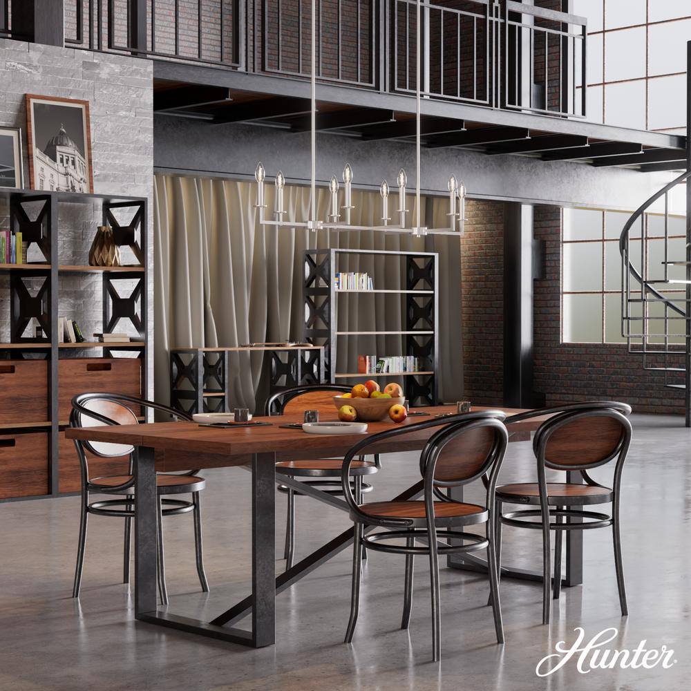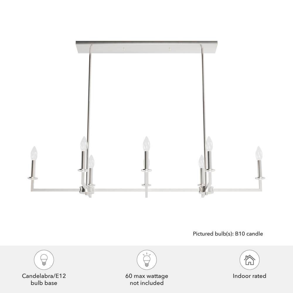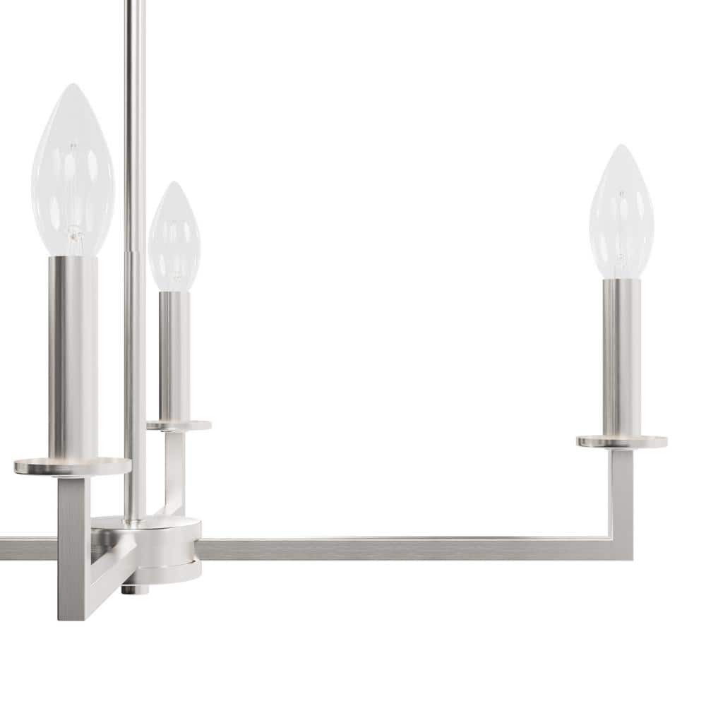 The Bearden 8-Light Chandelier by Hunter transforms spaces with its elegant brushed nickel finish and modern linear design. Perfect for lasting elegance in kitchens, dining rooms, and living areas, this chandelier features eight candle-like bulbs that offer a warm ambiance. With adjustable hanging lengths and minimal assembly, it's an ideal addition for both professional and DIY installations.