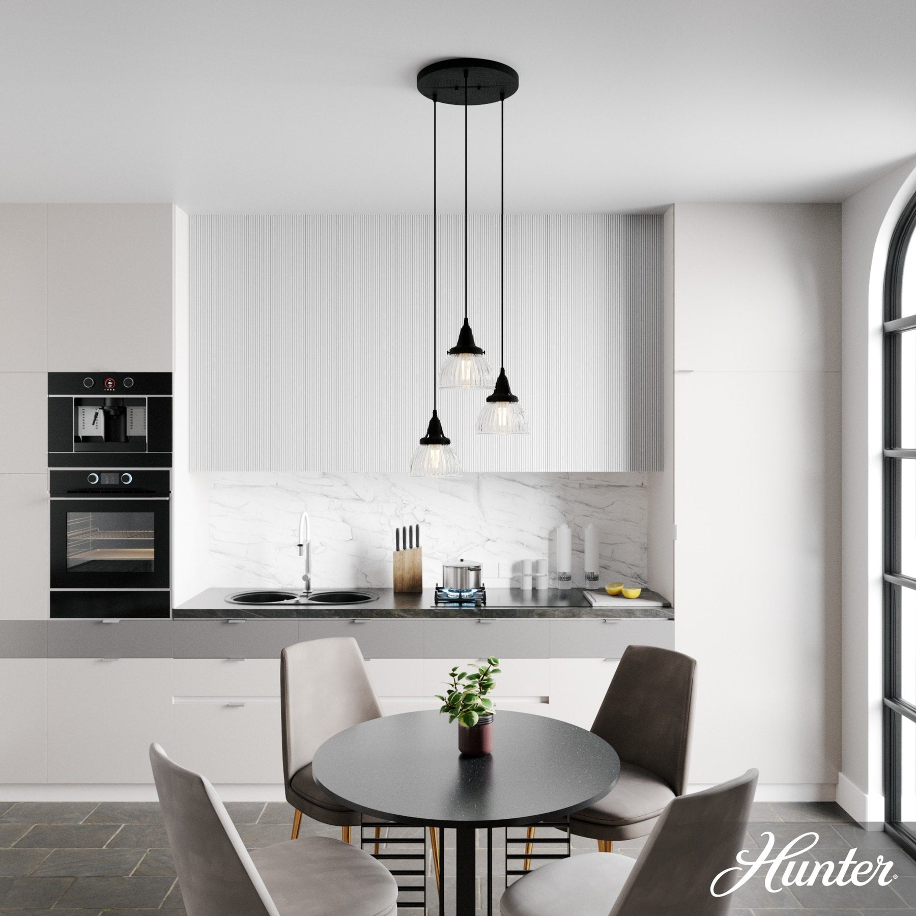 The Hunter Cypress Grove 3-Light Pendant transforms any room into a sanctuary of light and style. Its exquisite clear glass tiers cast an enchanting glow that dances across the walls, creating an ambiance of sophisticated charm. Imagine this pendant hanging majestically over a rustic oak dining table or illuminating a grand foyer entrance. This piece transcends mere functionality, becoming an essential element of luxe interior design that invites admiration and sets the stage for elevated living.