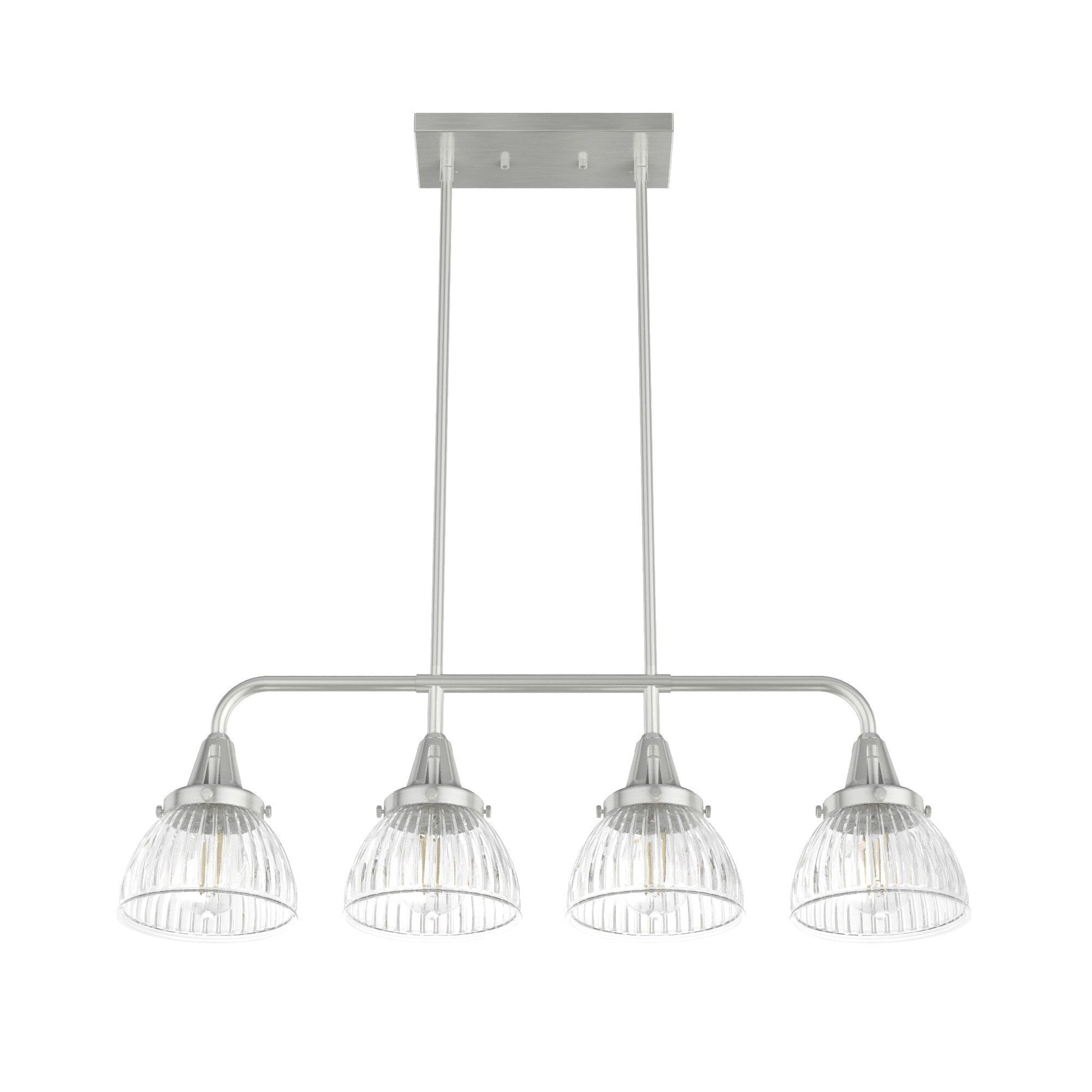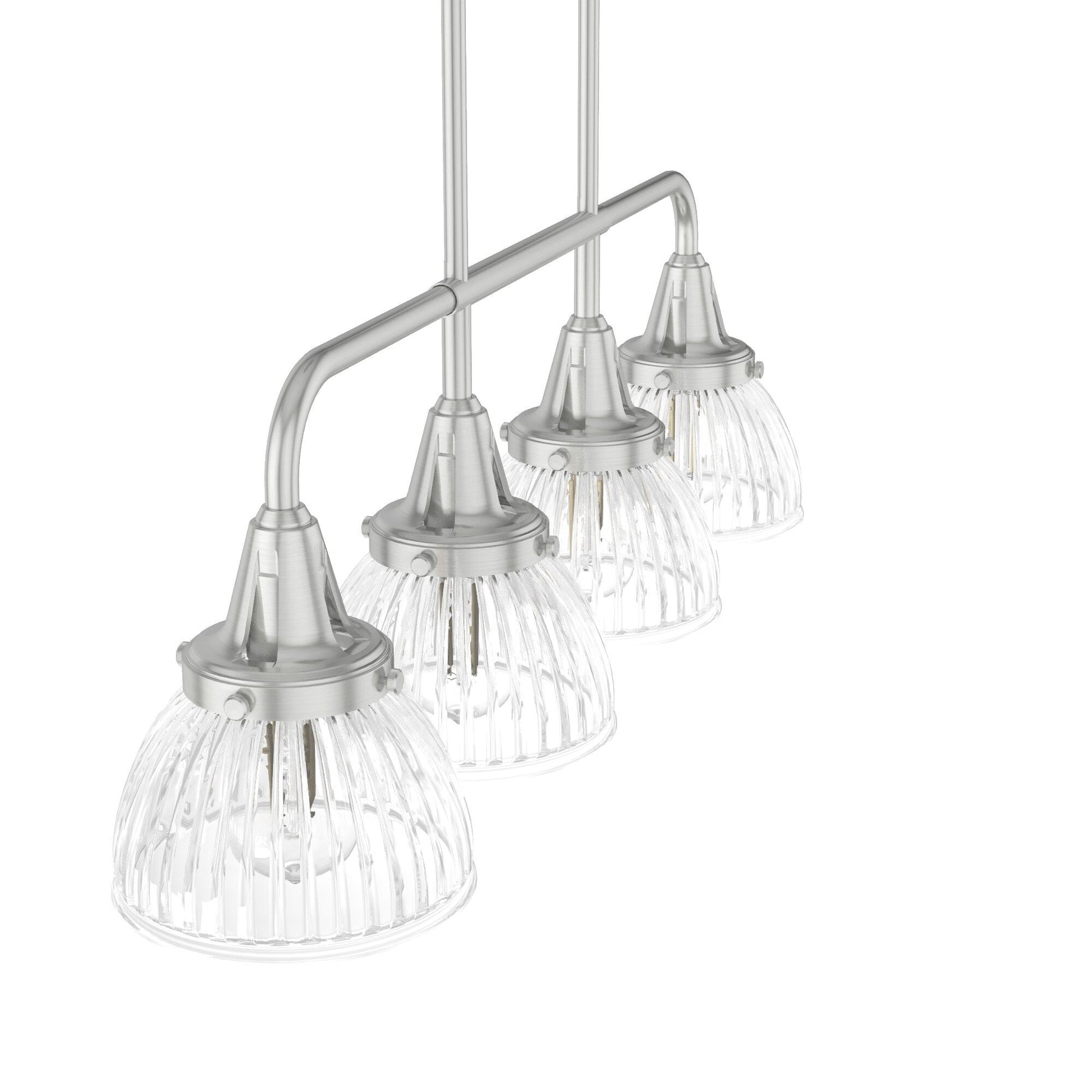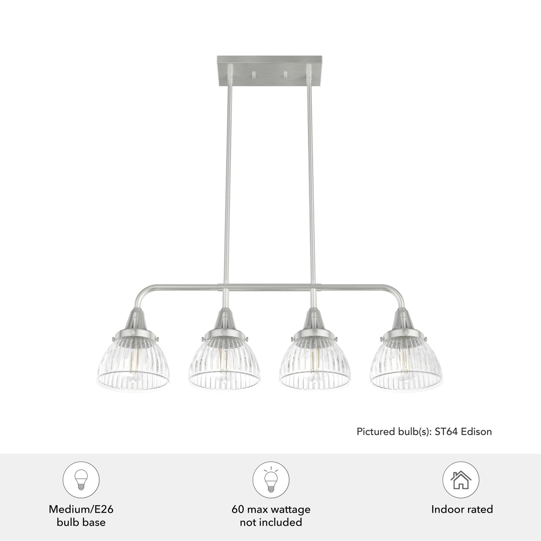 Illuminate your space with elegance and modern flair with the Hunter Cypress Grove 4-Light Brushed Nickel Chandelier. This transitional fixture combines strong lines with fluted glass to transform any kitchen, living room, or dining area into a luxuriously bright and inviting space.