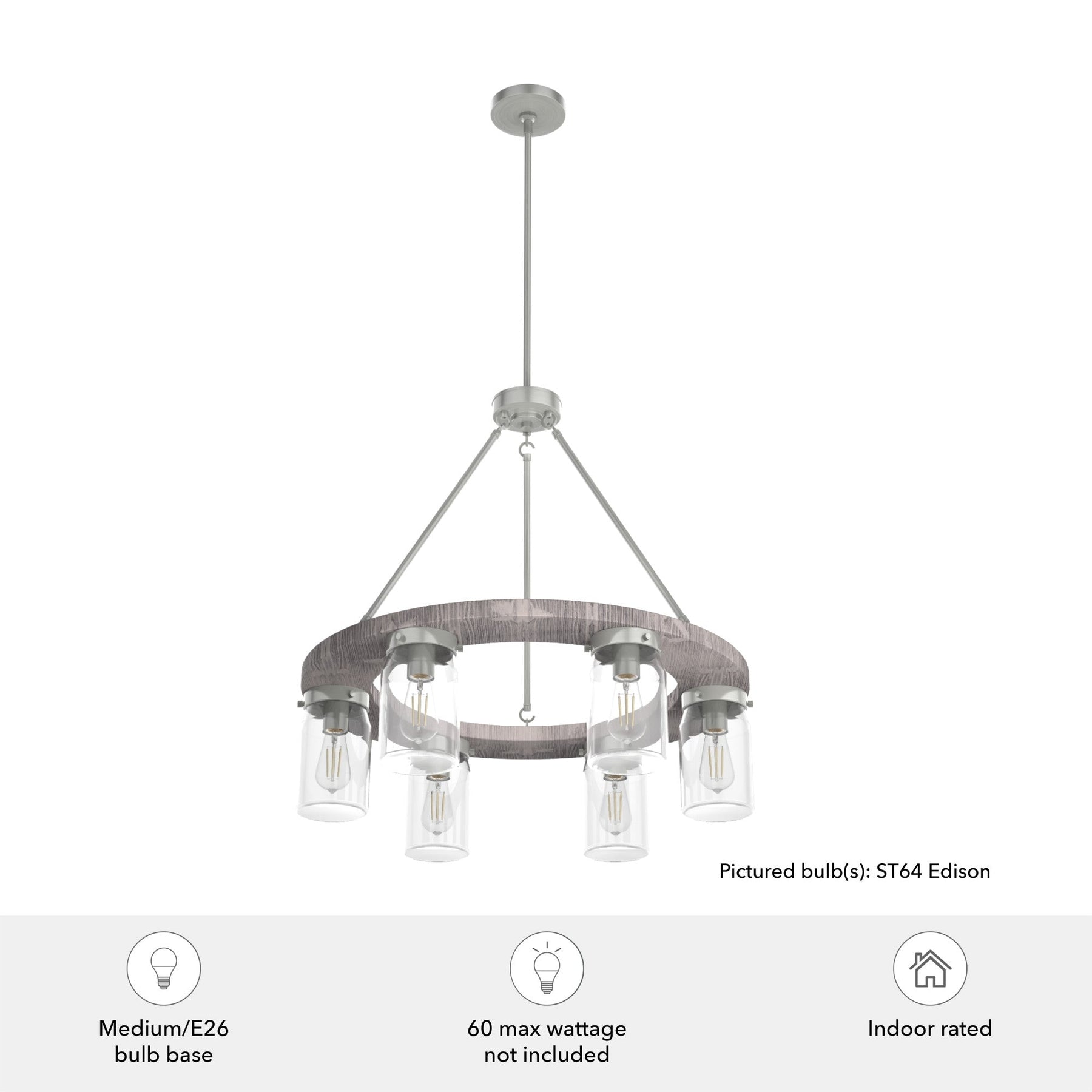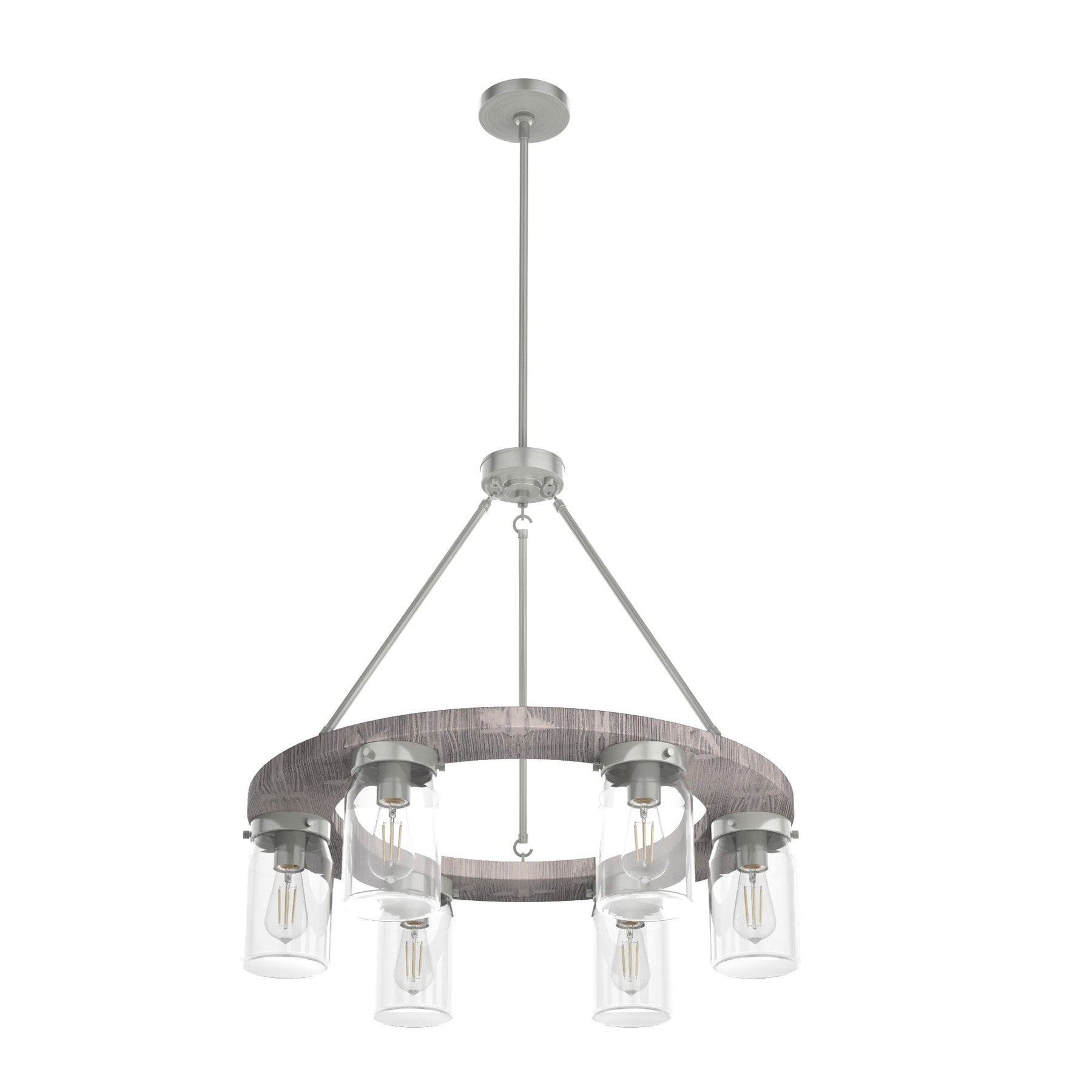 Illuminate your space with the Hunter Devon Park 6-Light Brushed Nickel Farmhouse LED Chandelier. Designed with a brushed nickel finish and clear glass shades, this chandelier combines rustic charm with modern elegance, seamlessly enhancing kitchens, dining rooms, and living areas.