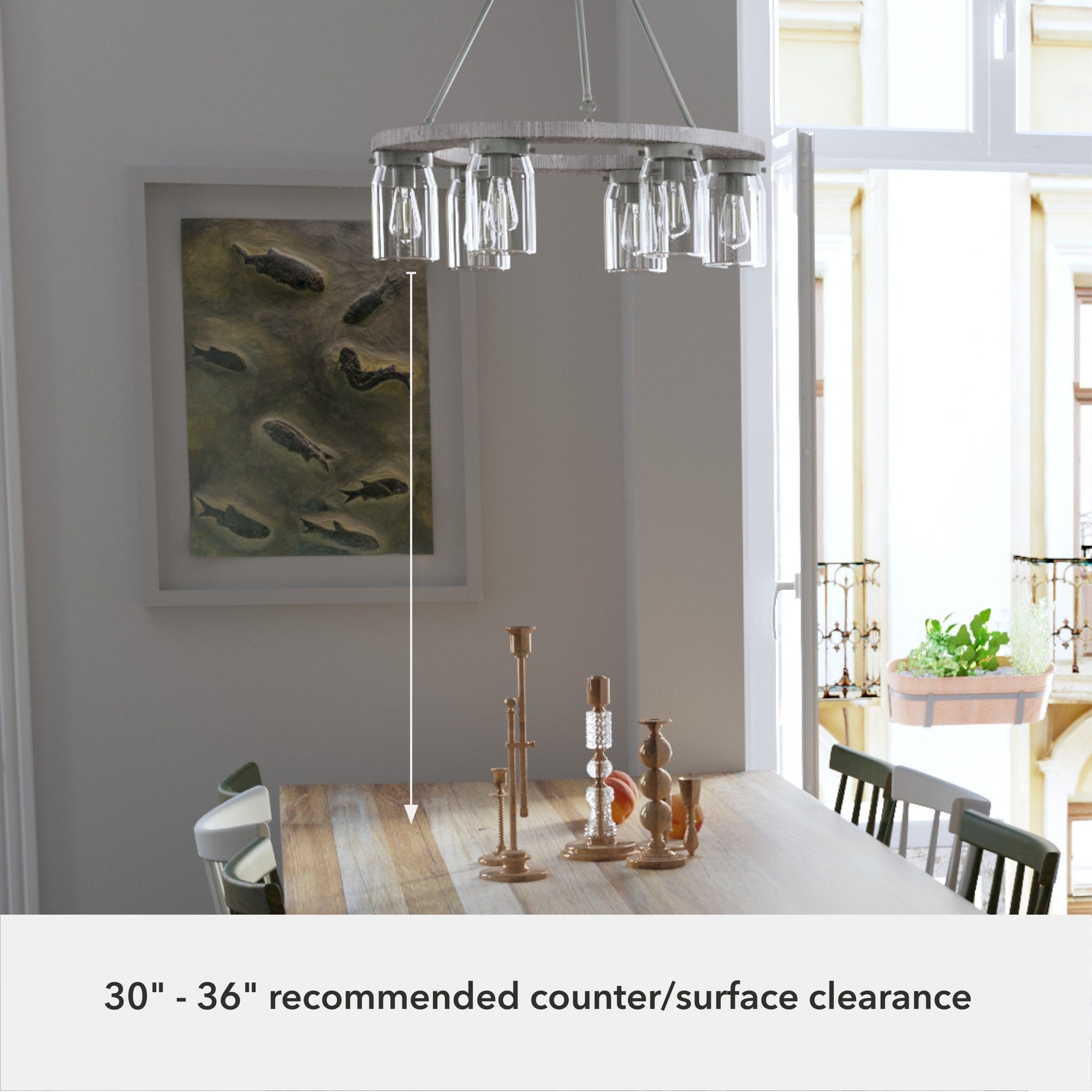 Transform your home into a haven of rustic elegance with the Devon Park chandelier's harmonious embrace of wood and glass elements. Its exquisite brushed nickel finish reflects both tradition and modernity, casting a glow that is simultaneously radiant and serene. Imagine this masterpiece as the focal point in a dining room or kitchen nook, creating a welcoming warmth ideal for family gatherings and intimate dinners. Embrace the charm of farmhouse chic with this stunning fixture that turns everyday lighting into an art form, making luxury accessible yet beautifully understated.