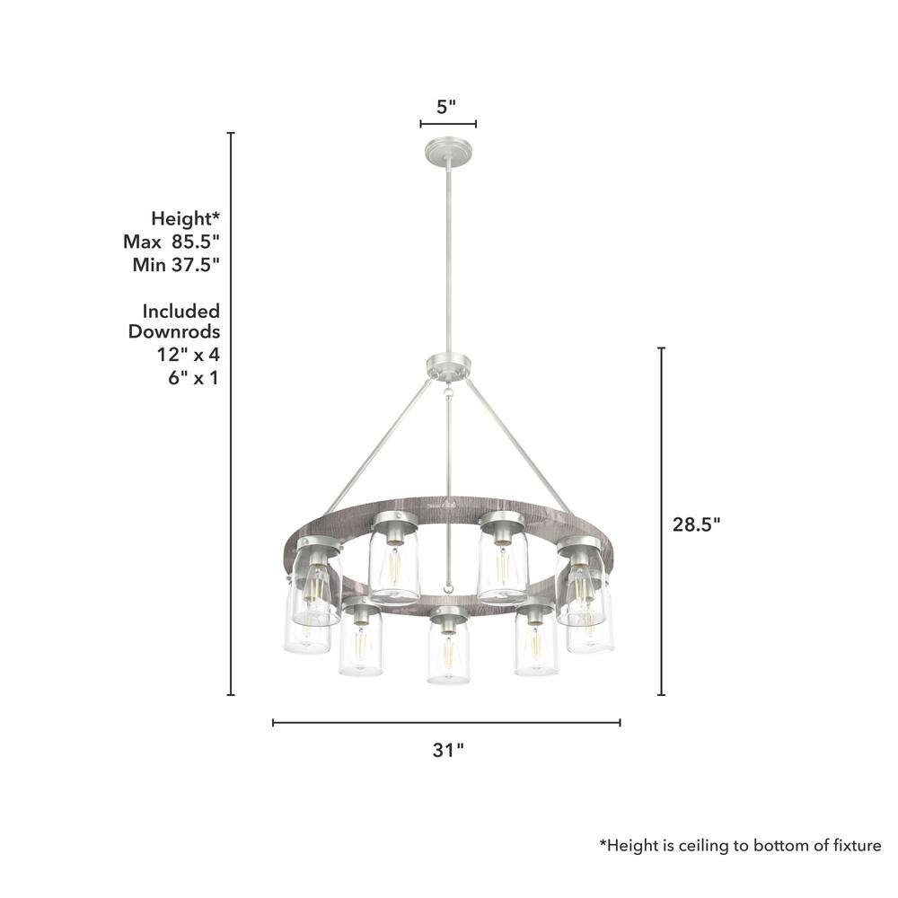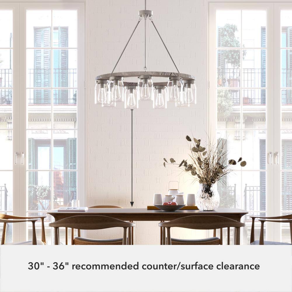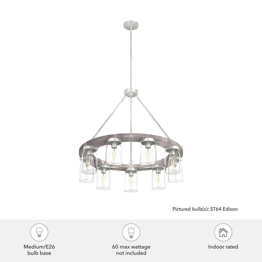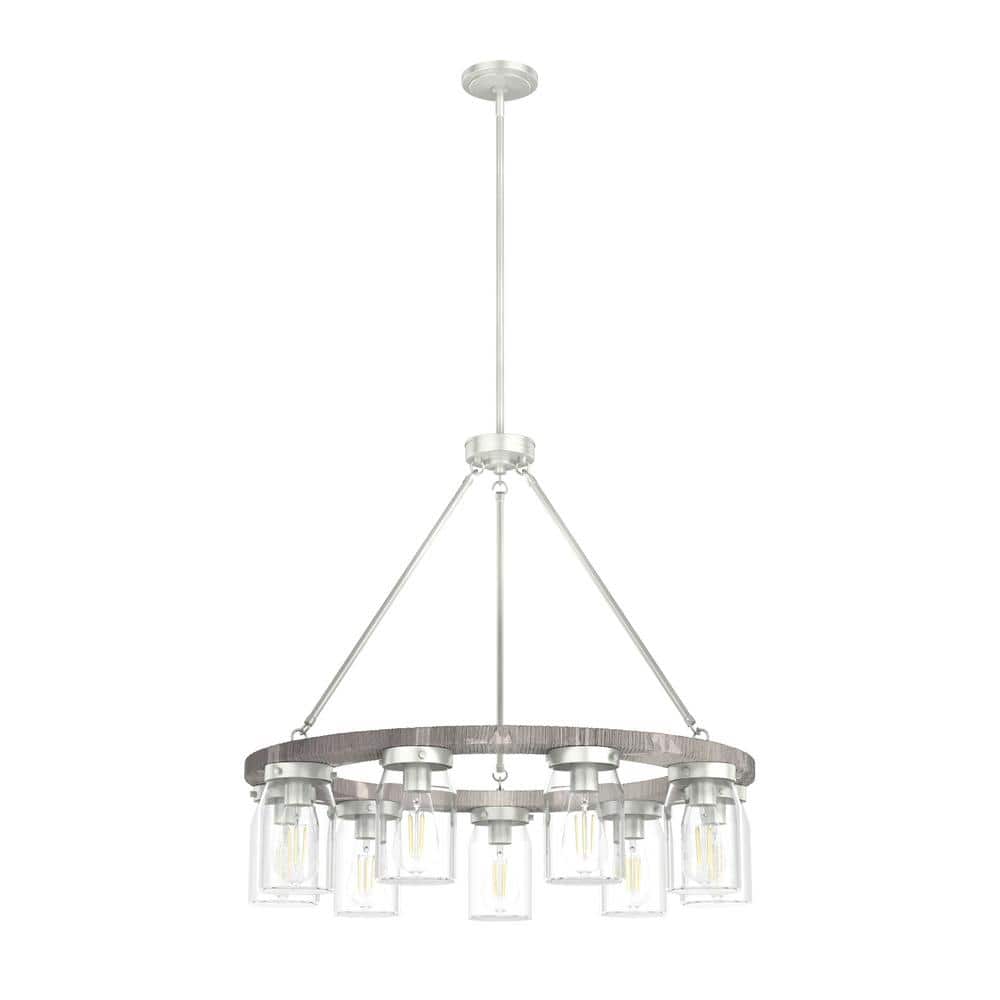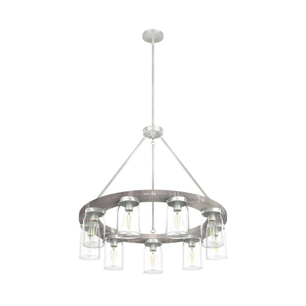 Illuminate your home with the Devon Park 9-Light Wagonwheel Chandelier from Hunter. This rustic piece features a brushed nickel finish, clear glass shades, and a design that evokes the charm of farmhouse décor. Perfect for kitchens and dining rooms, it effortlessly combines style with functionality.