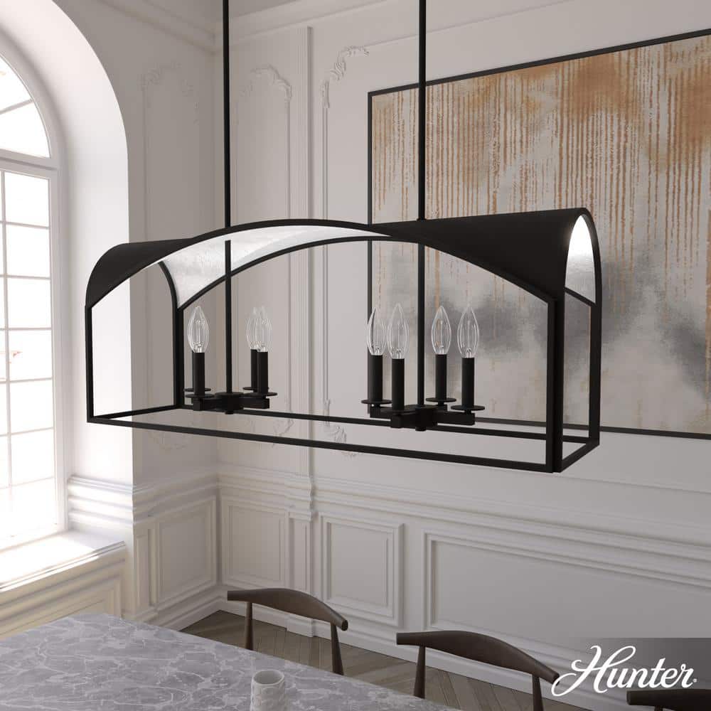 Transport your living space with the Hunter Dukestown Chandelier—a fusion of art and illumination. Its gracefully arched silhouettes, adorned with silver leaf detailing, emanate an understated opulence. Style this piece above a grand dining table or a chic kitchen island where its ambient glow accentuates every detail of your decor. Truly, this chandelier is a luminous testament to luxurious living.