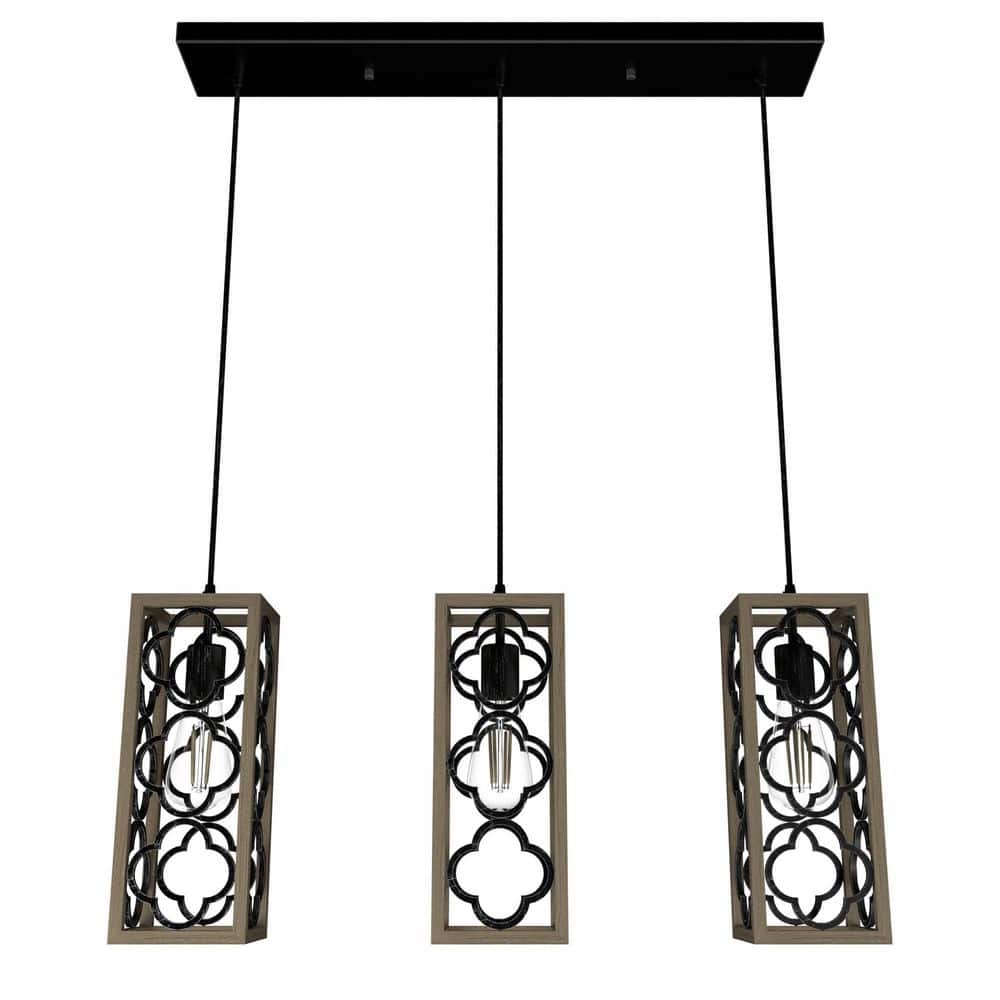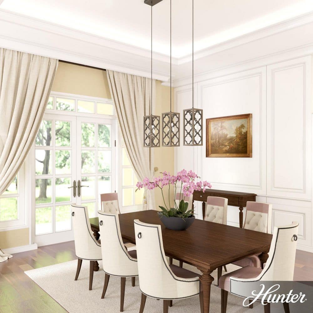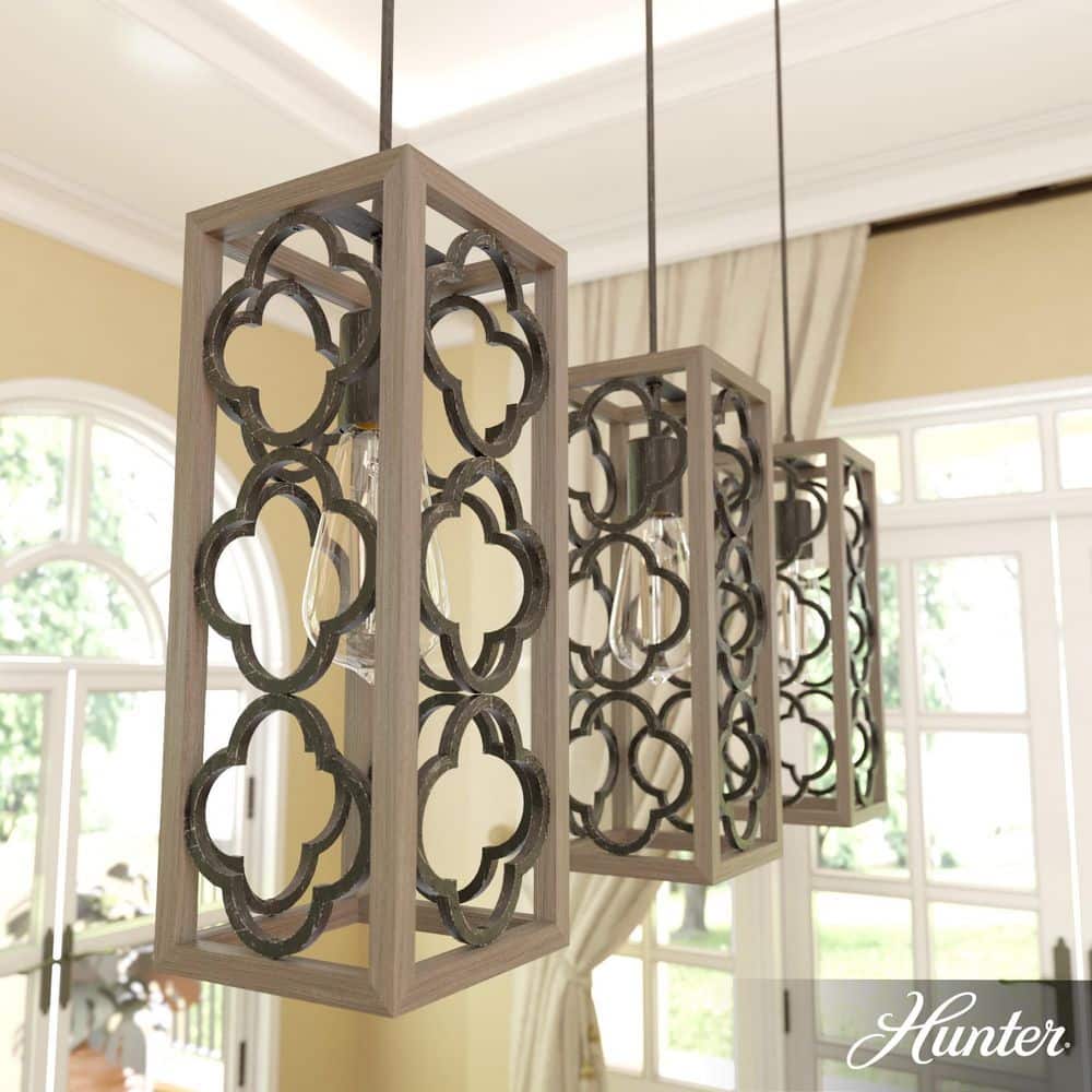 Transform your dining space with the Hunter Gablecrest 3-Light French Oak Chandelier. This elegant fixture boasts a European-inspired quatrefoil design, offering both style and warmth to any room. With its adjustable hanging length and durable metal construction, it combines aesthetic appeal with practicality.