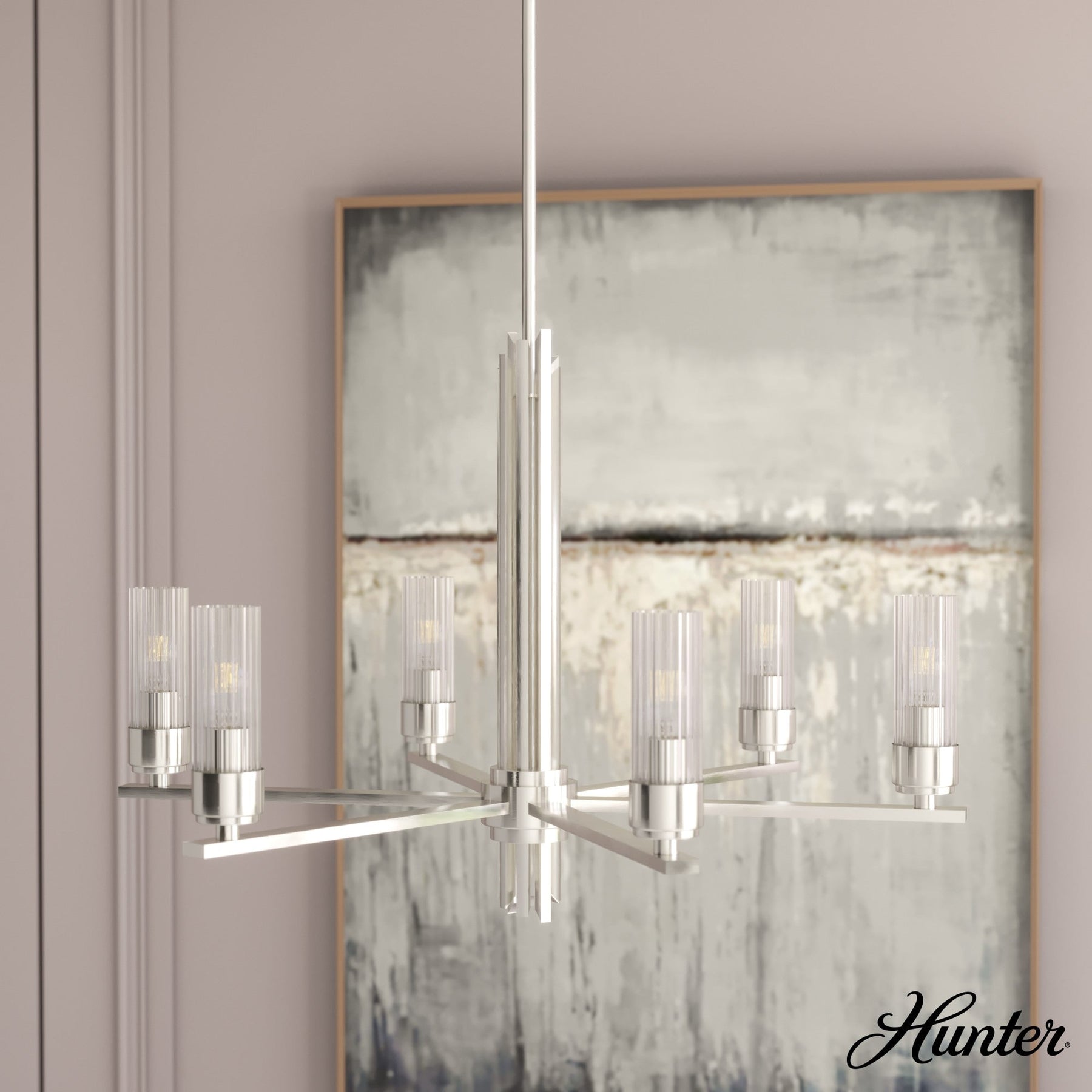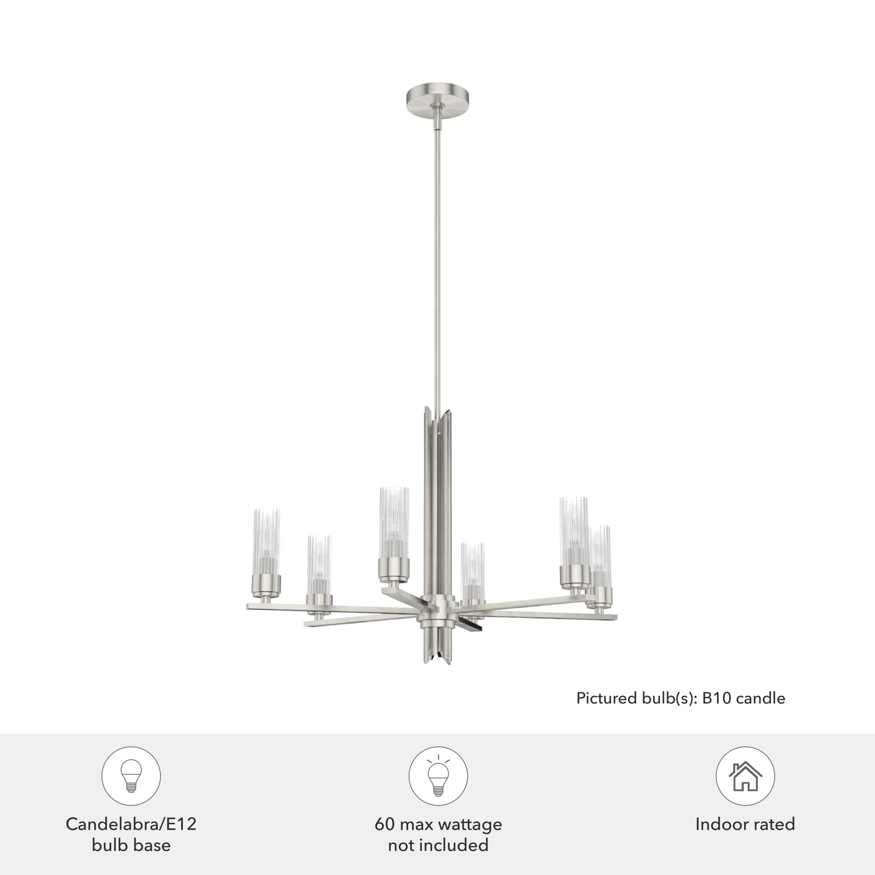 Illuminate your space with modern elegance using the Hunter Gatz 6-Light Brushed Nickel LED Chandelier. Featuring ribbed glass shades and a sophisticated brushed nickel finish, this fixture brings an air of contemporary sophistication to any room. Crafted from durable metal, it's designed to last while providing effortlessly adjustable hanging options for versatile installation.