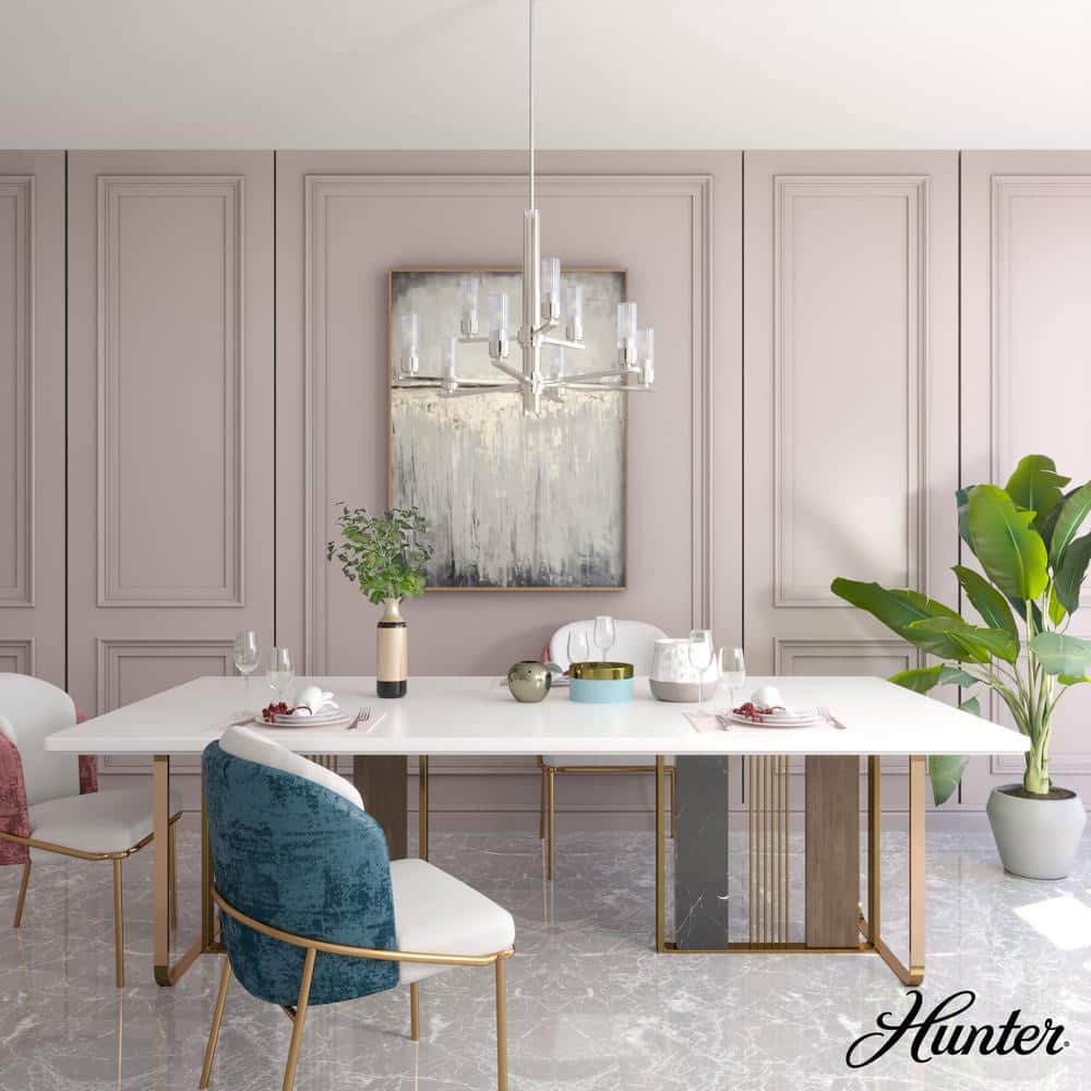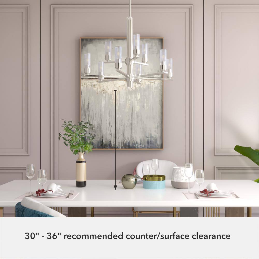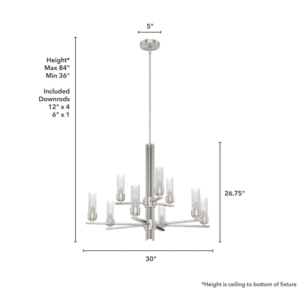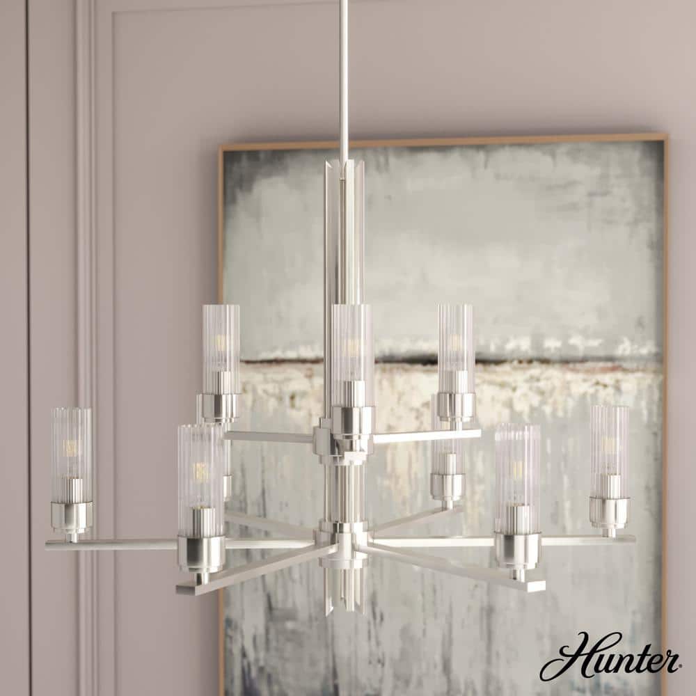 Illuminate your space with the sophisticated Gatz 9-Light Chandelier from Hunter. Featuring a modern brushed nickel finish and elegant ribbed glass shades, this chandelier is perfect for adding a touch of glamour to kitchens, dining rooms, and foyers. Designed for flexibility, this fixture includes adjustable downrods and is dimmable, allowing for customized ambiance.