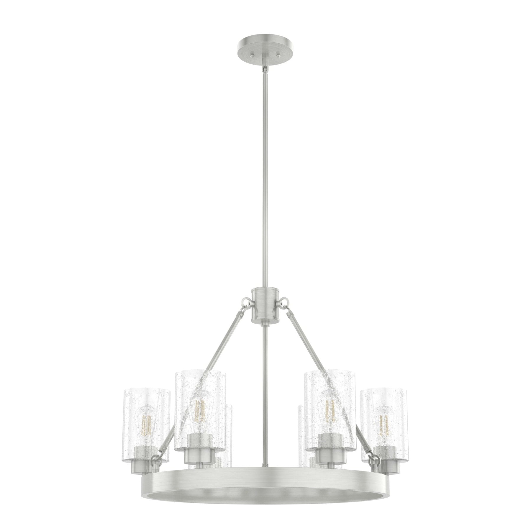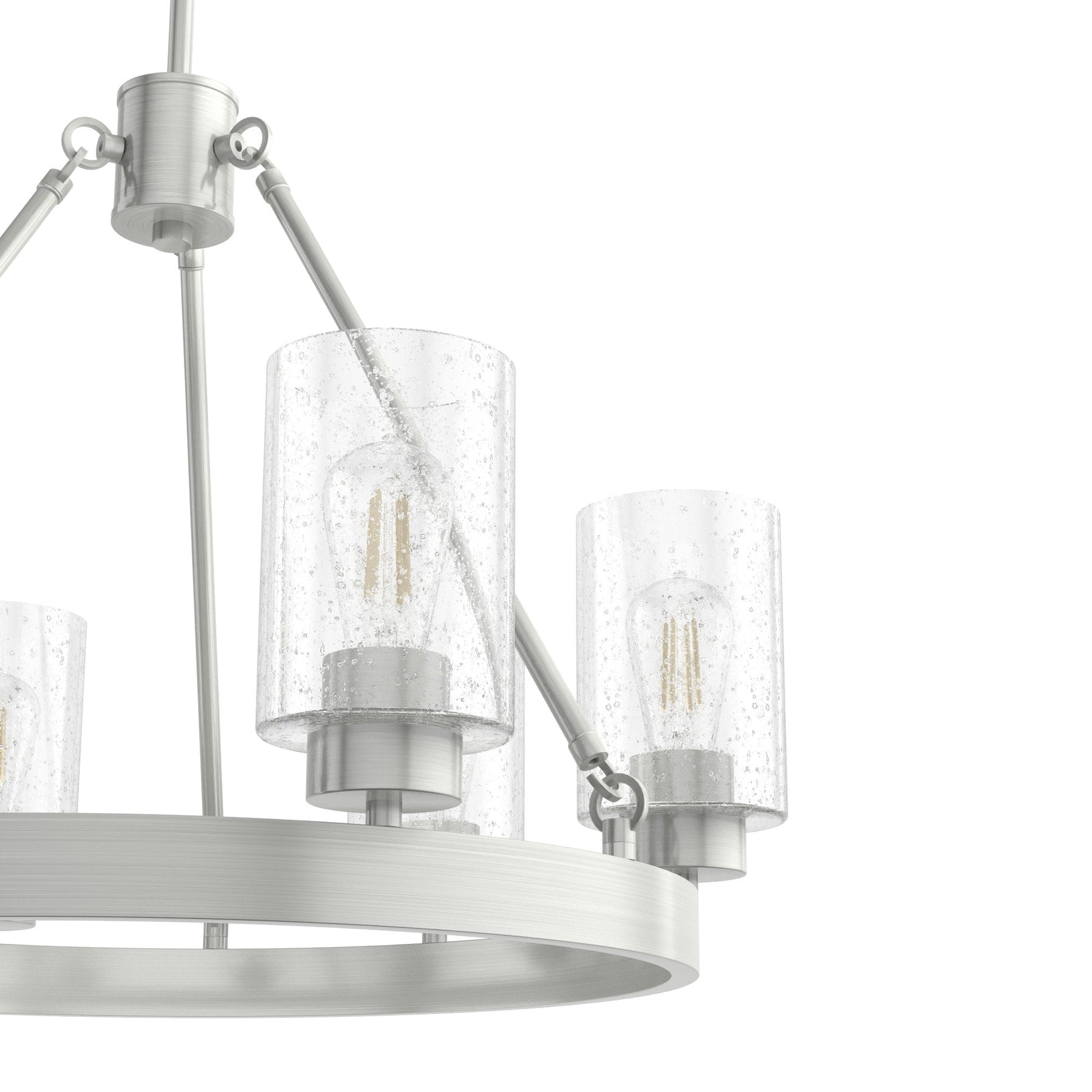 Elevate your interiors with the Hunter Hartland 6-Light Brushed Nickel LED Chandelier. Featuring a striking farmhouse design, this chandelier is equipped with premium seeded glass shades and a durable metal frame that promises lasting elegance and functionality. Perfect for kitchens, dining rooms, and living areas, it blends seamlessly with transitional decor styles.