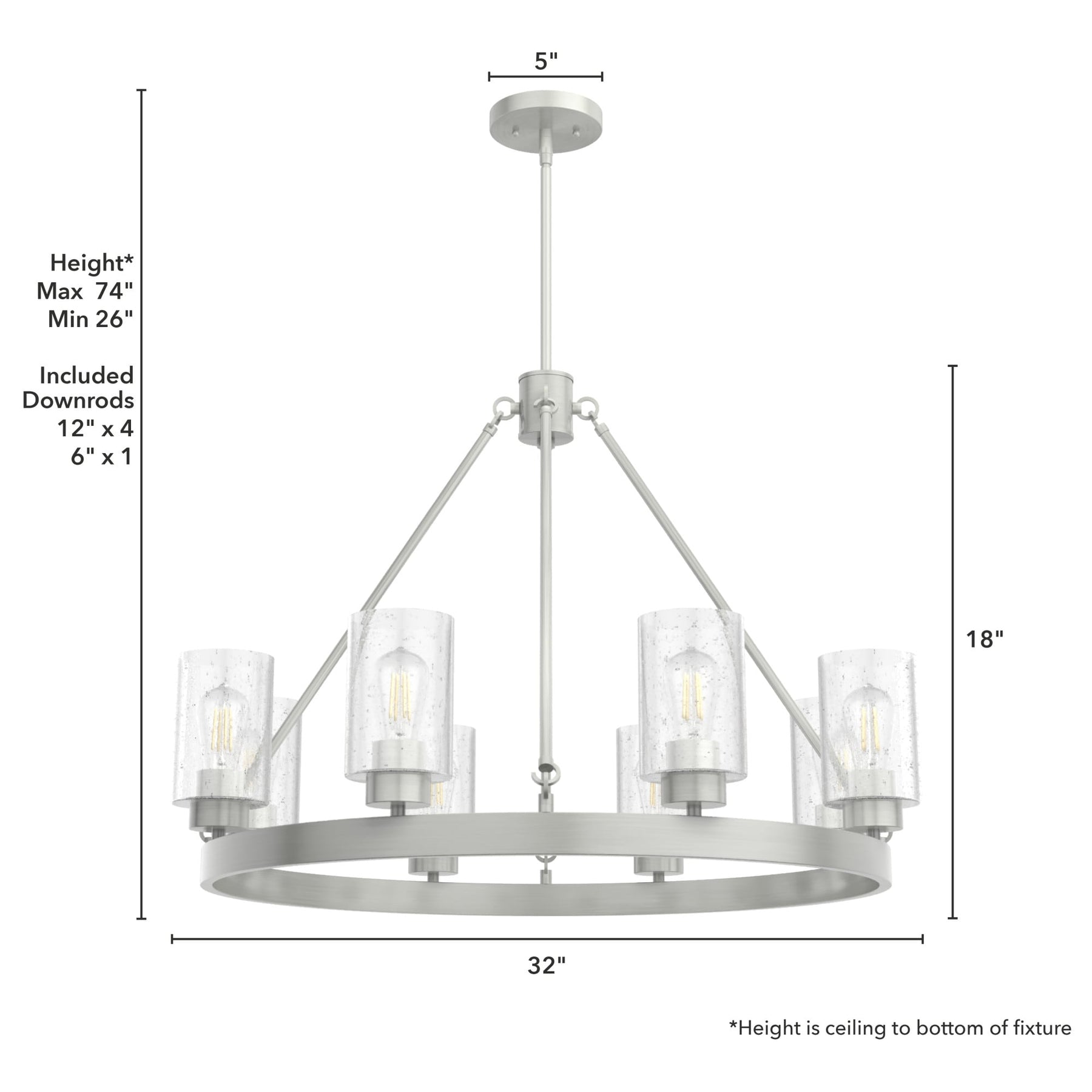The Hartland 8-Light Chandelier instantly revives any room with its warm, inviting glow and rustic farmhouse appeal. The seeded glass shades delicately diffuse the light, casting sparkling reflections that dance around the space. With its brushed nickel finish and elegant lines, it effortlessly bridges the gap between modern sophistication and timeless charm. Imagine it gracing your dining room or foyer, making every moment feel like a luxurious yet cozy embrace.
