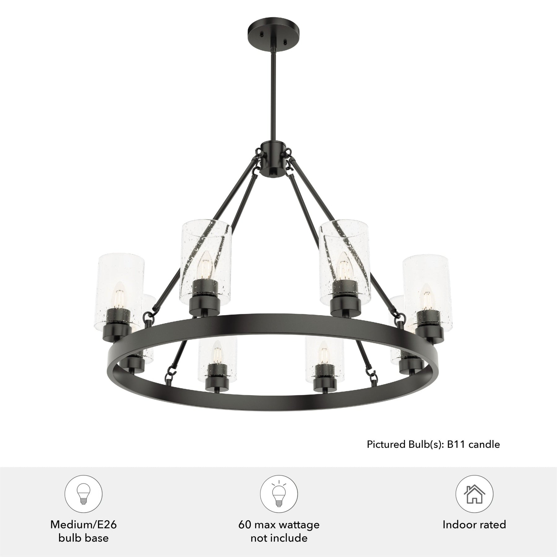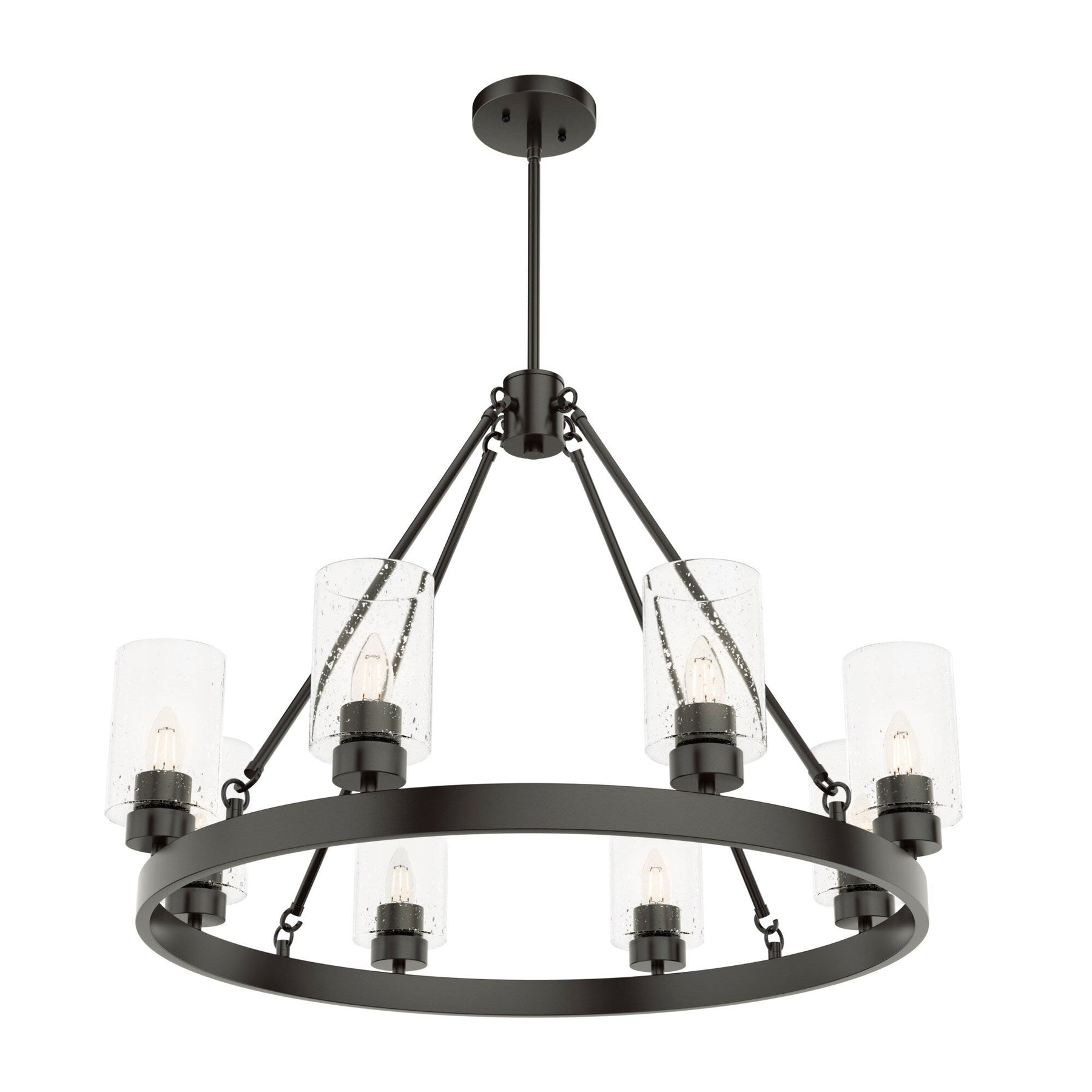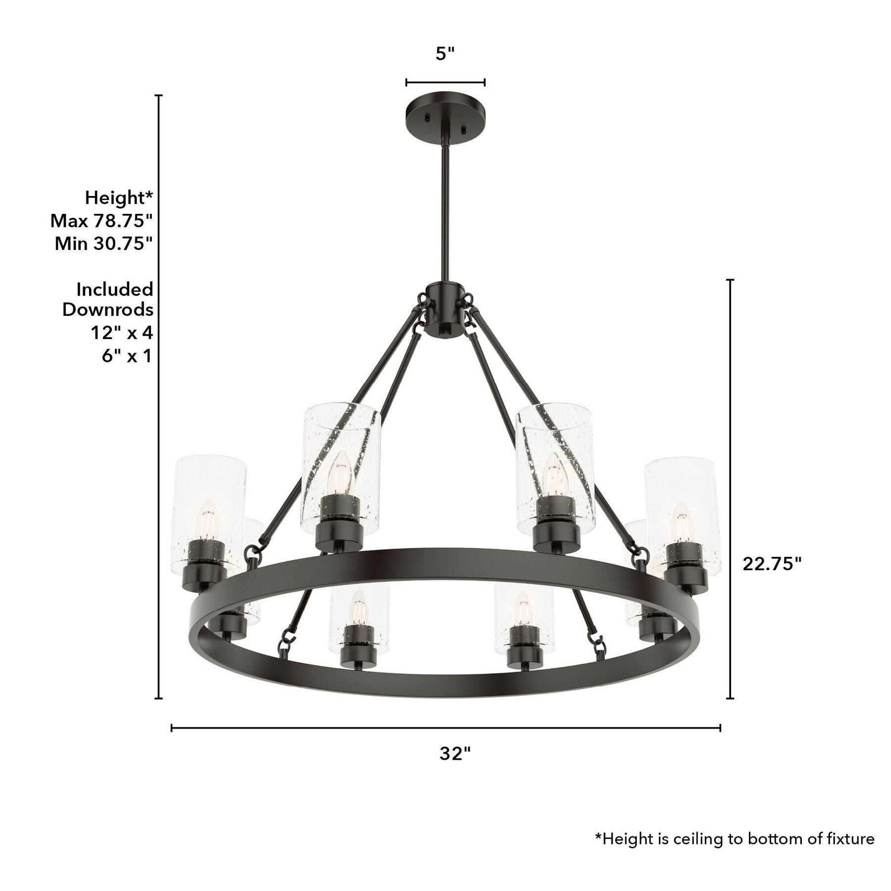 Illuminate your space with the Hunter Hartland 8-Light Matte Bronze Chandelier, a beautifully crafted lighting fixture that encapsulates farmhouse charm with its noble bronze finish and clear seeded glass shades. Ideal for kitchens, dining rooms, and living areas, this chandelier offers adjustable hanging lengths to fit seamlessly into any space.