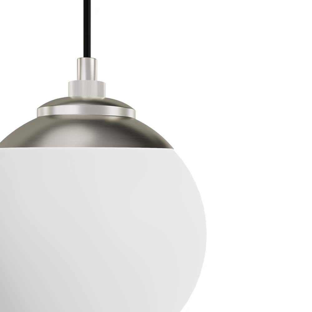 The Hunter Hepburn 3-Light Chandelier showcases a mid-century modern style with a brushed nickel finish and cased white glass shades. It's perfect for illuminating spaces with elegance and adaptability, featuring adjustable hanging lengths and dimmable capabilities to fit various settings.
