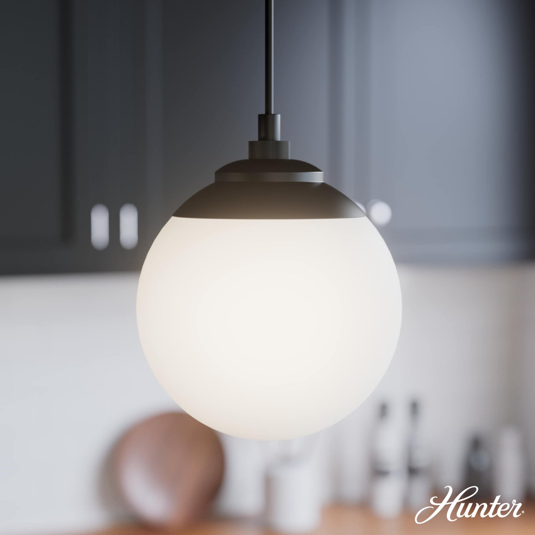 Illuminate your space with the elegant Hunter Hepburn 3-Light Chandelier, featuring a matte black finish and premium cased white glass. This glamorous mid-century modern fixture is ideal for adding sophistication to any dining room or living area, with adjustable hanging height for tailored elegance.