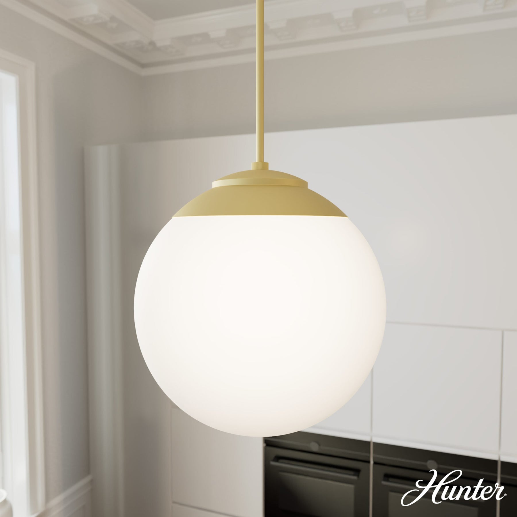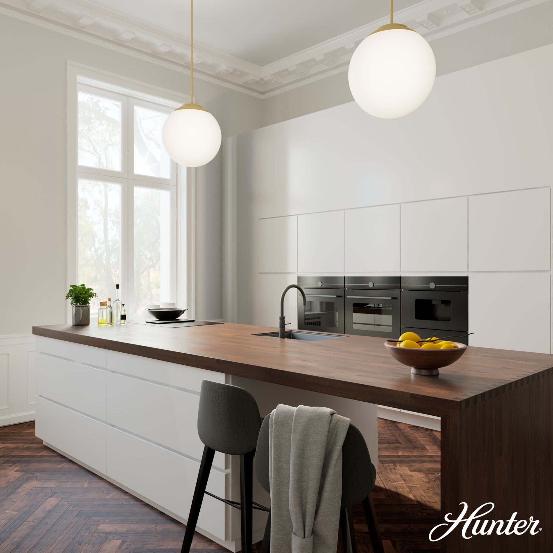 Introducing the Hunter Hepburn 3-Light Pendant—a timeless piece that brings the elegant charm of mid-century design into any modern space. Featuring a luxurious painted modern brass finish and striking cased white glass globes, this fixture offers both functionality and flair. Ideal for kitchens, dining areas, and living rooms, this pendant blends seamlessly with chic interiors.